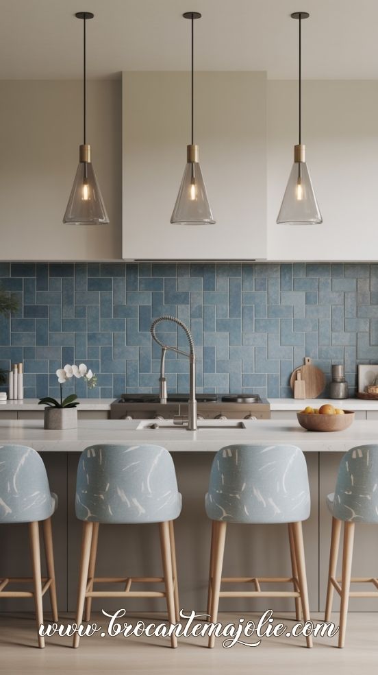 Pendant lights with blue glass shades, woven materials, or natural textures work beautifully above a kitchen island.