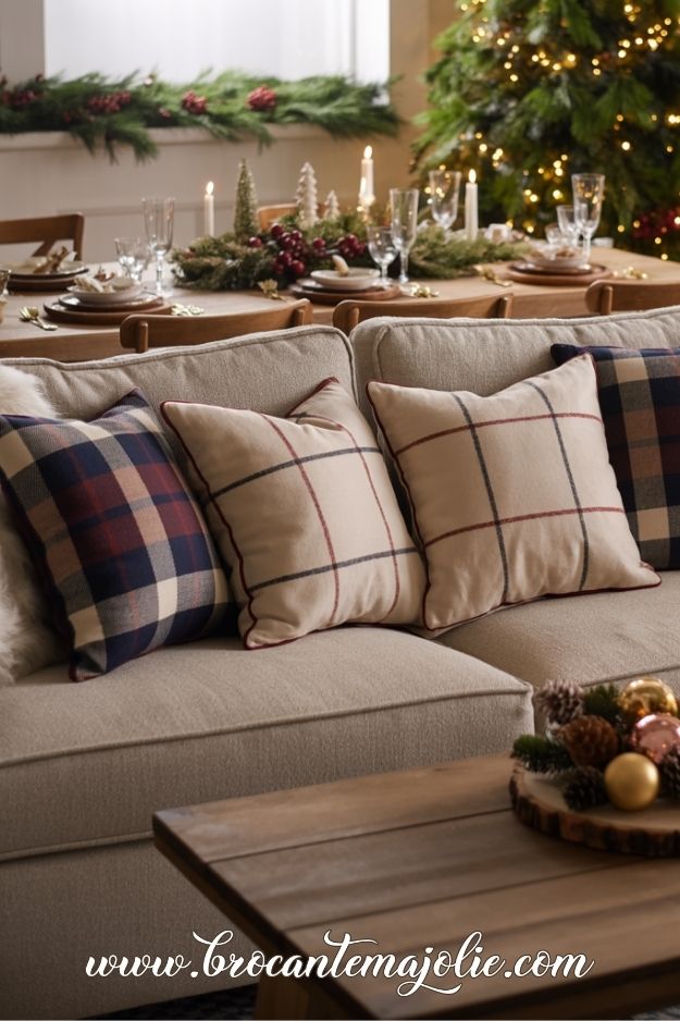 Neutral tones like cream, beige, and soft greys create a calming backdrop, while subtle pops of red or green add a festive touch.
