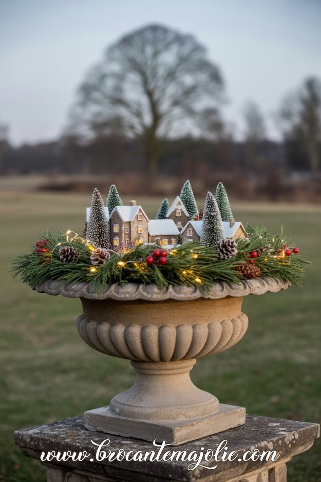 Don’t forget to add a touch of greenery with potted evergreens, holly bushes, or small Christmas trees placed in galvanized buckets or wooden crates.