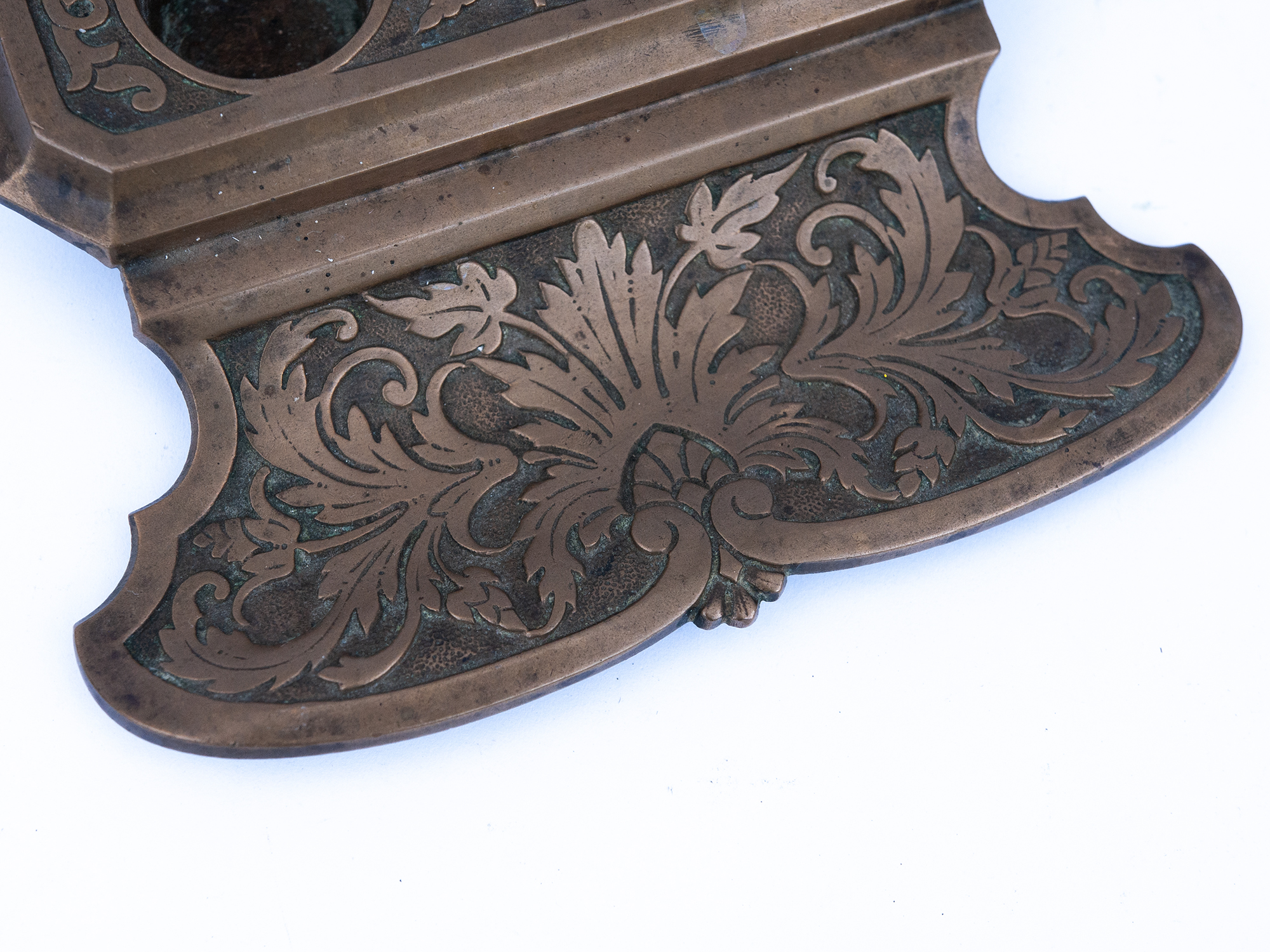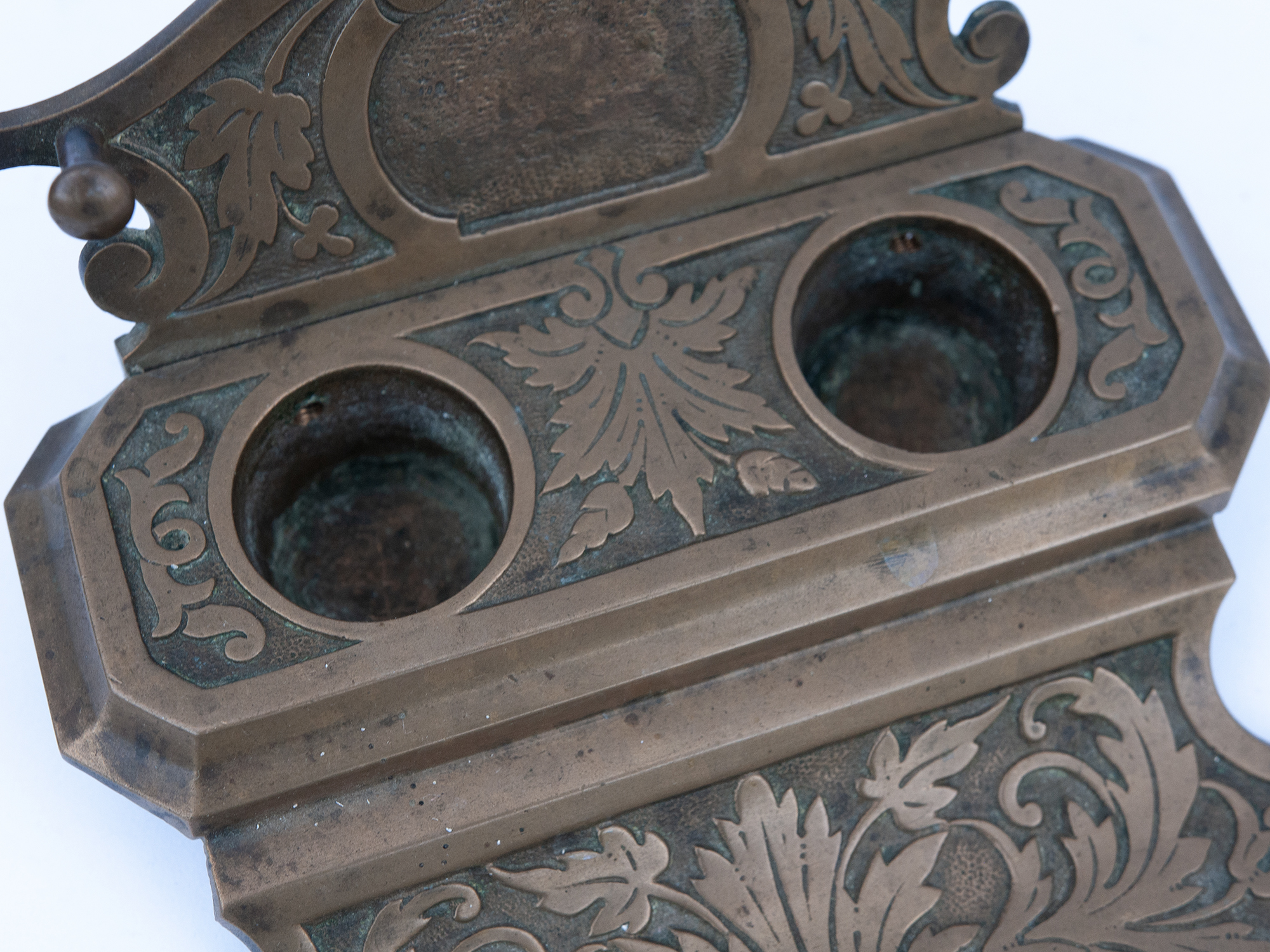 The piece features two ink reservoirs set into a sculptural bronze base adorned with scrolling foliage and classical ornamentation. The decorative backplate and curved front tray give it presence.