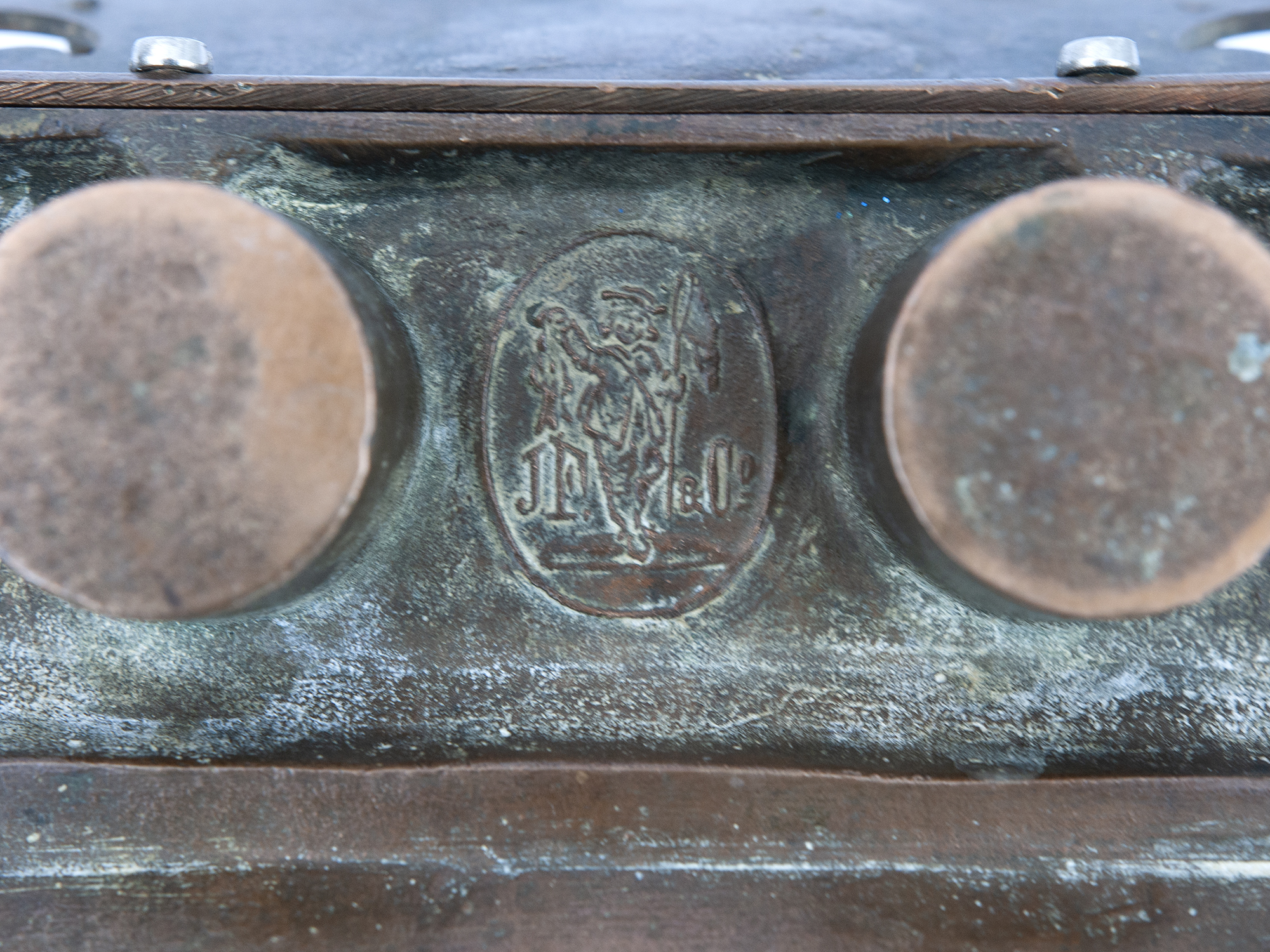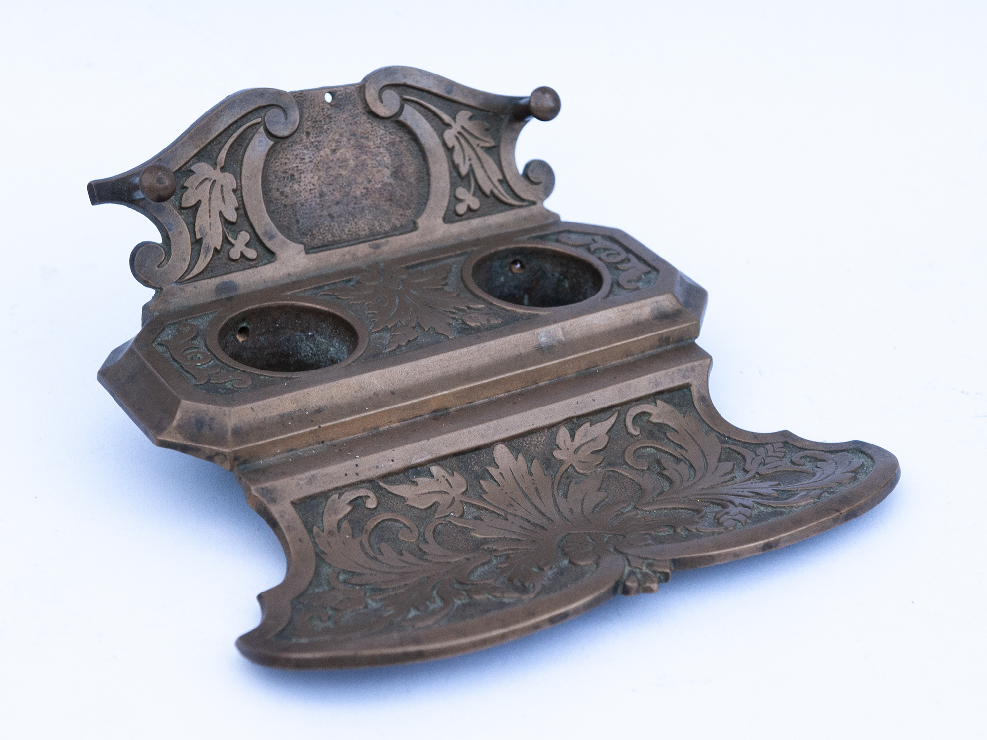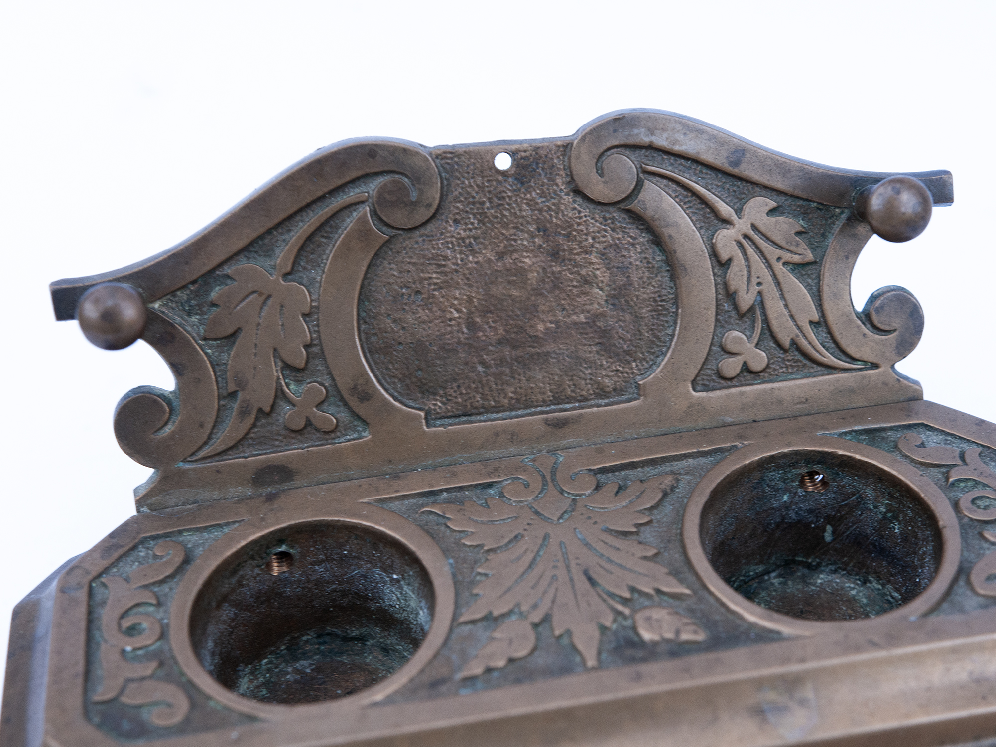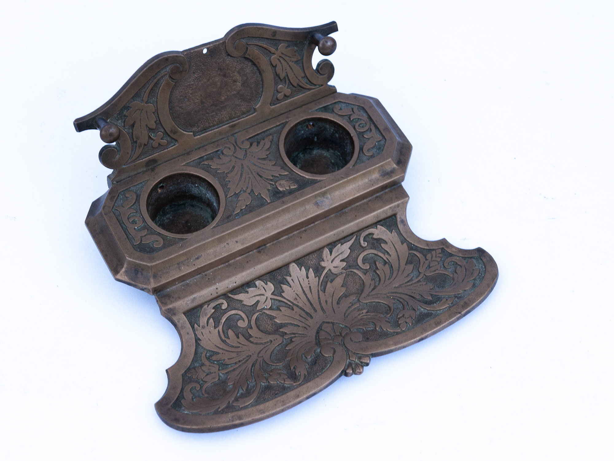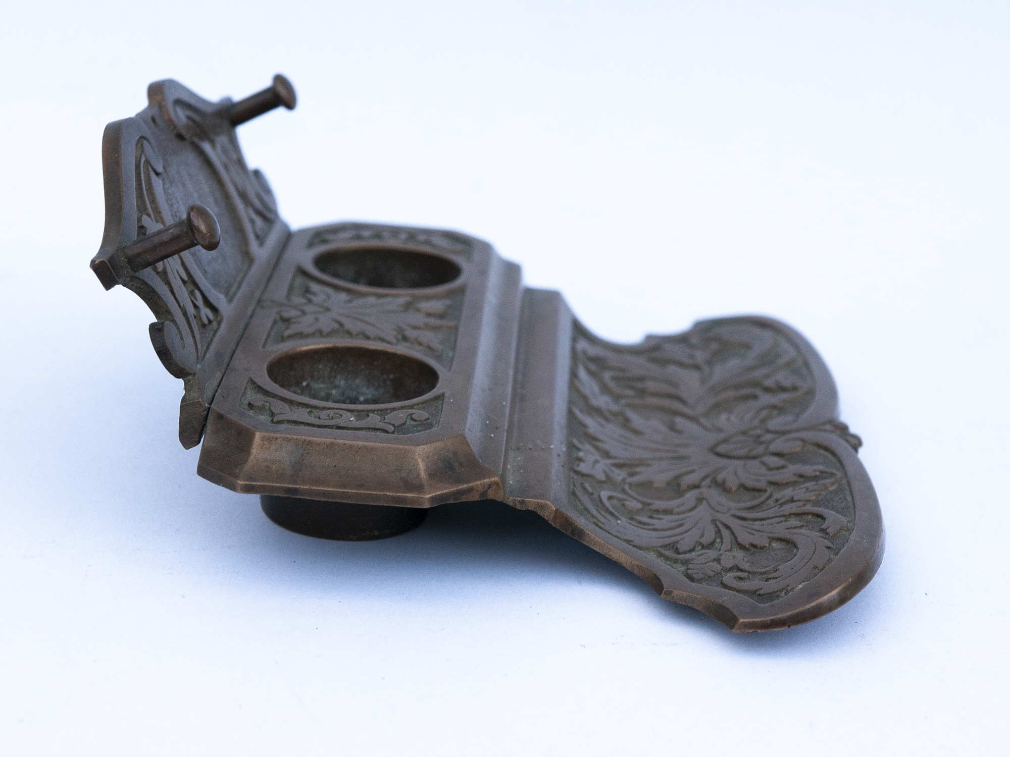 Each ink opening is threaded. These threads were originally intended to hold screw-in glass or ceramic ink liners, sometimes fitted with lids, allowing the bronze structure to remain clean while the ink sat in removable inserts. The liners are no longer present, which is common for pieces of this age.
