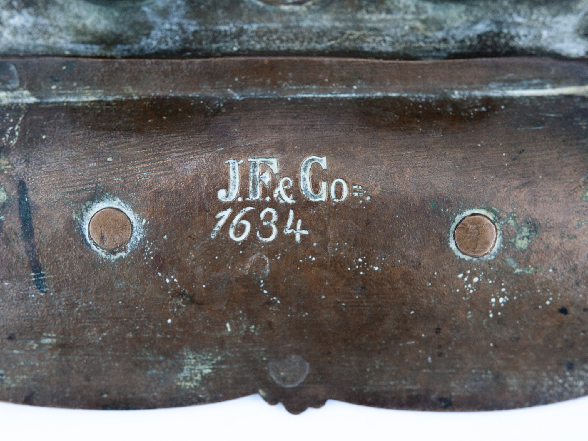 Stamped “J.F. & Co – 1634”, this inkwell likely dates from the late 19th century and fits well within the Napoleon III / Second Empire aesthetic, known for its revival of classical motifs and ornate metalwork. The marking appears to be a maker or model reference rather than a date.