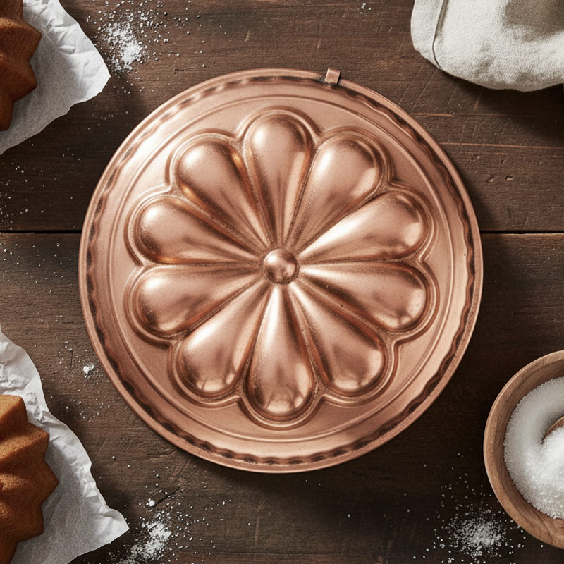 Large vintage round pastry mold made of pressed copper, with a brass ring that allows it to be hung on the wall if necessary. It features a beautiful sunflower motif. It’s lined and can be used for cooking.