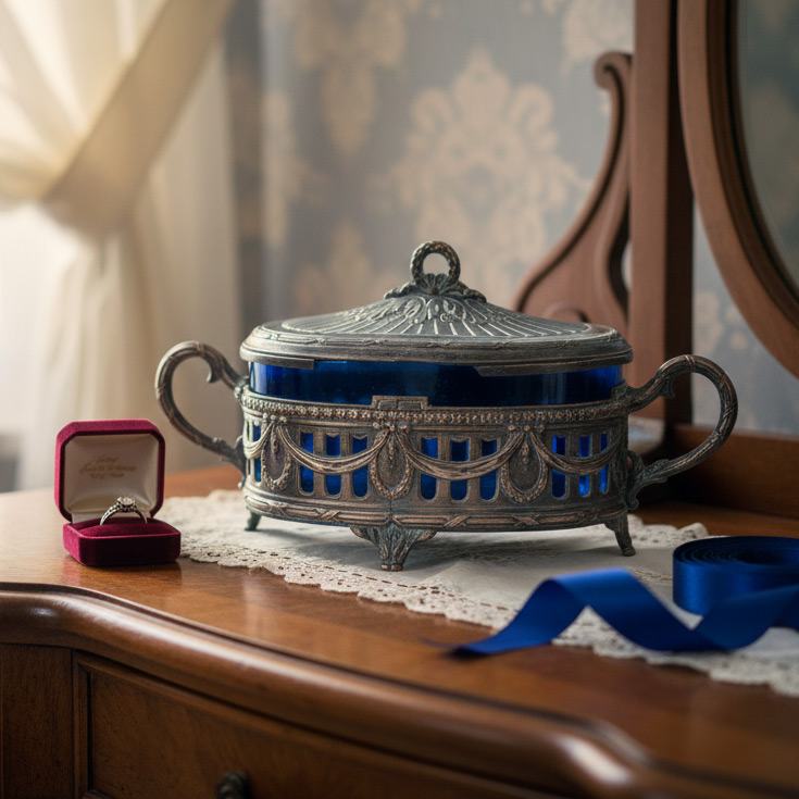 This exquisite antique French trinket box, inspired by the Art Nouveau era, is a refined collector’s piece. Designed in the shape of a planter, it features intricate metalwork with garland motifs, likely made of copper alloy, and a stunning cobalt blue glass insert. A true decorative gem, perfect for holding jewelry, keepsakes, or small treasures.