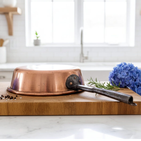 โฅ DESCRIPTION Antique French copper saucepan, rather rare to find. The rim is rolled over, and the interior was once tin-lined but has since darkened with age. There is a divot in the center of the underside of the base, indicating that the coppersmith used a compass to mark out the radius of the circle of copper cut from a flat sheet to form the pan. The handle is fixed to the pan body with three copper rivets, and there’s a pierced hanging hole at the end. A beautiful and very old piece! โฅ DIMENSIONS (Diameter x Height x Length): 11.5 x 3.5 x 19.5″ โฅ WEIGHT: Approximately 4.2 lbs โฅ CONDITION: This saucepan is in very good condition, with very slight possible dents and minor scratches. The interior will need to be retinned if you intend to use it for cooking.