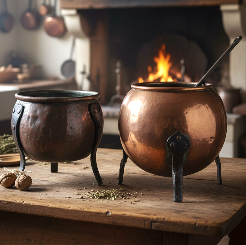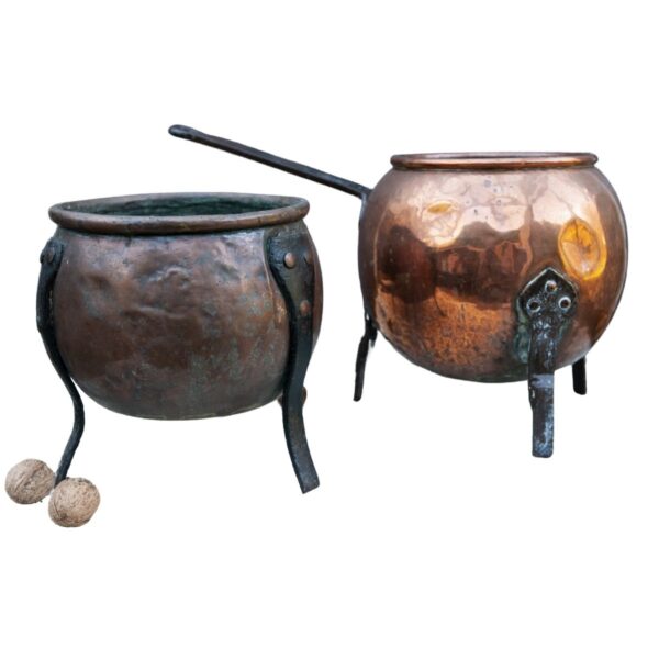 โฅ DESCRIPTION: Set of 2 antique copper glue boiler pans, used in the past to heat the glue. Each copper bowl is supported on 3 metal legs. Each leg has been firmly riveted to the base using small copper rivets. One of the two pots has a long metal handle, also riveted on the side with copper rivets. They date from the 19th century. They can now be used as planters as they are waterproof! โฅ CONDITIONS: they show signs of use including small stains and bumps that accentuated their character, oxidization inside (refer to photos). Waterproof. โฅ DIMENSIONS: – Larger one: 8 1/3 x 7 x 14″ (Height w Diameter x Length) – Smaller one: 7 x 6 3/4″ (Height x Diameter) โฅ TOTAL WEIGHT: 5.7 lbs (2.6 kg)