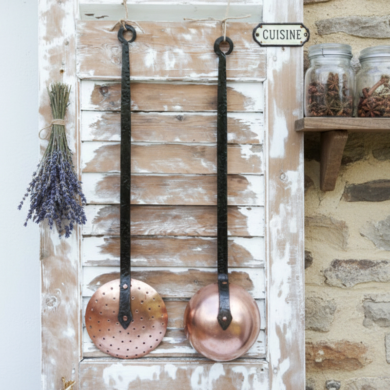 This set of vintage French copper kitchen utensils includes a skimmer and a ladle, each featuring a long wrought iron handle with a rustic, handcrafted design. These versatile pieces can be retinned for cooking or simply used as decorative kitchen accents, bringing authentic French farmhouse charm to your space.
