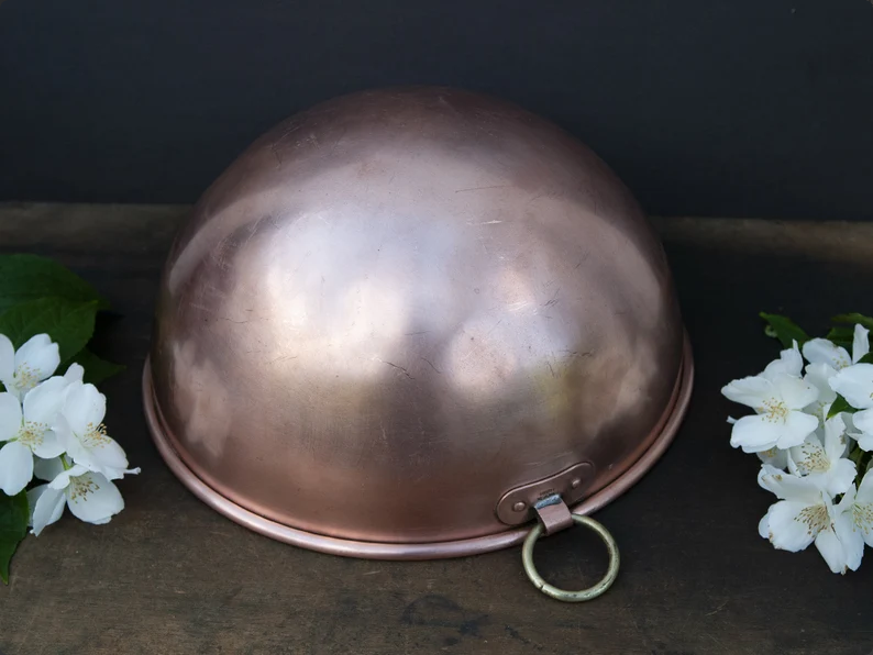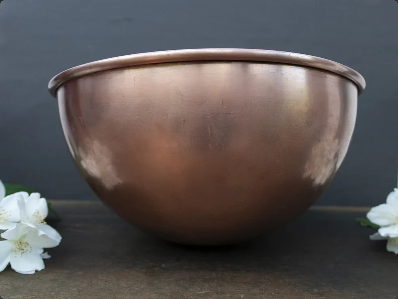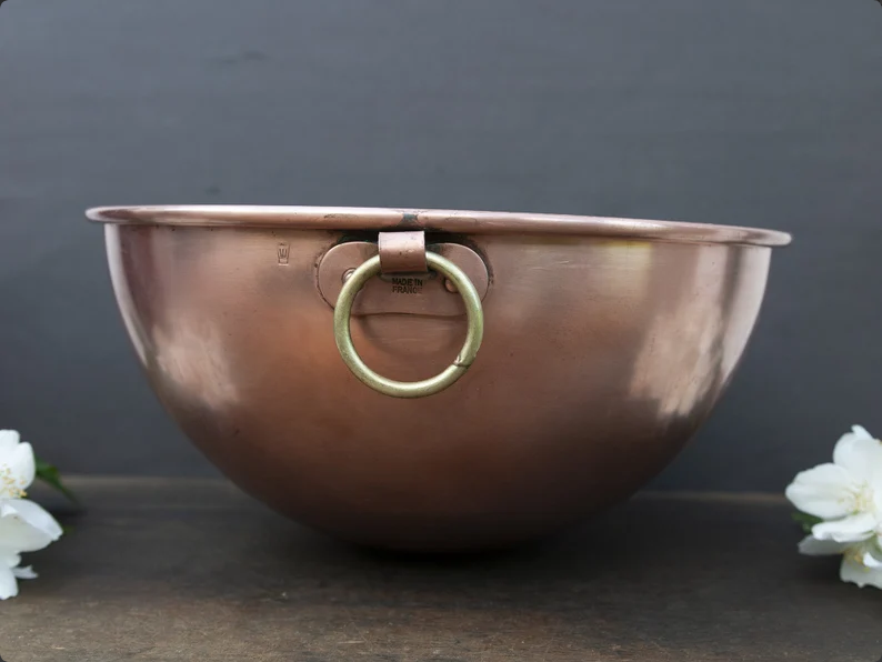 Large vintage French copper mixing bowl, stamped with a famous chef’s hat from the “Matfer” brand and “Made in France”.