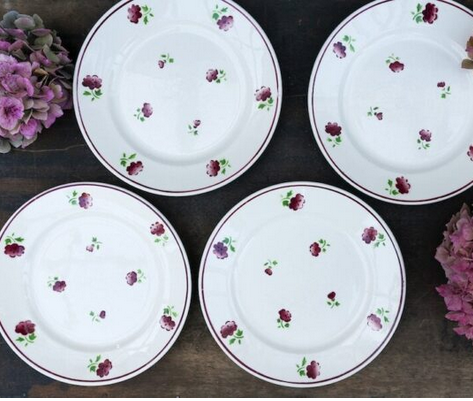 ♥ DESCRIPTION:Set of 4 French dinner plates in white ceramic with a lovely red floral decor from BADONVILLER (France). They’re from 1900’s. ♥ CONDITIONS: show some signs of use: classic defects of old dinnerware with micro scratches and one small chip on the back of one plate (refer to photos) ♥ DIAMETER: 9″ ♥ TOTAL WEIGHT: 2.8 lbs | 1.3 kg