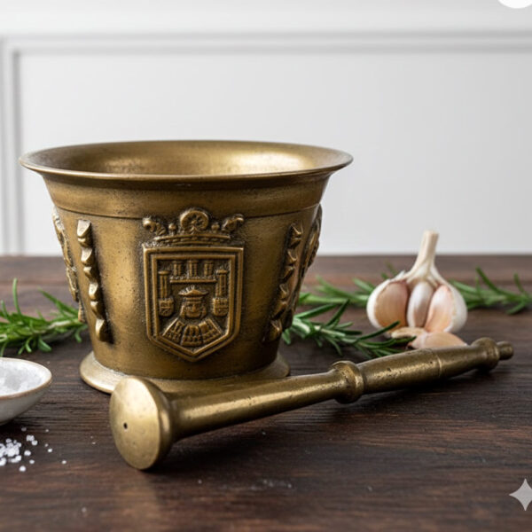 This extra-large antique French bronze mortar and pestle is a rare and exceptional piece, originally used in apothecaries for grinding herbs and medicinal substances. Crafted from solid bronze, it features a striking design with a masculine face on one side and an ornate coat of arms on the other, adding to its historical charm. Given its substantial weight and size, this piece is not only a collectorโs treasure but also makes a unique champagne bucket or centerpiece for vintage-inspired decor.