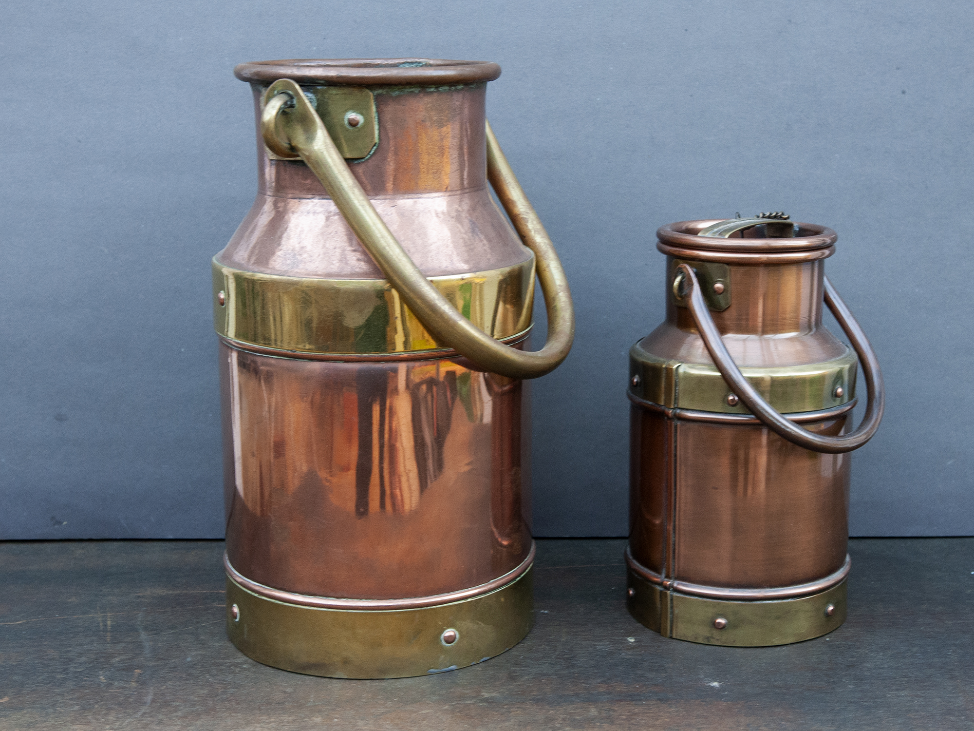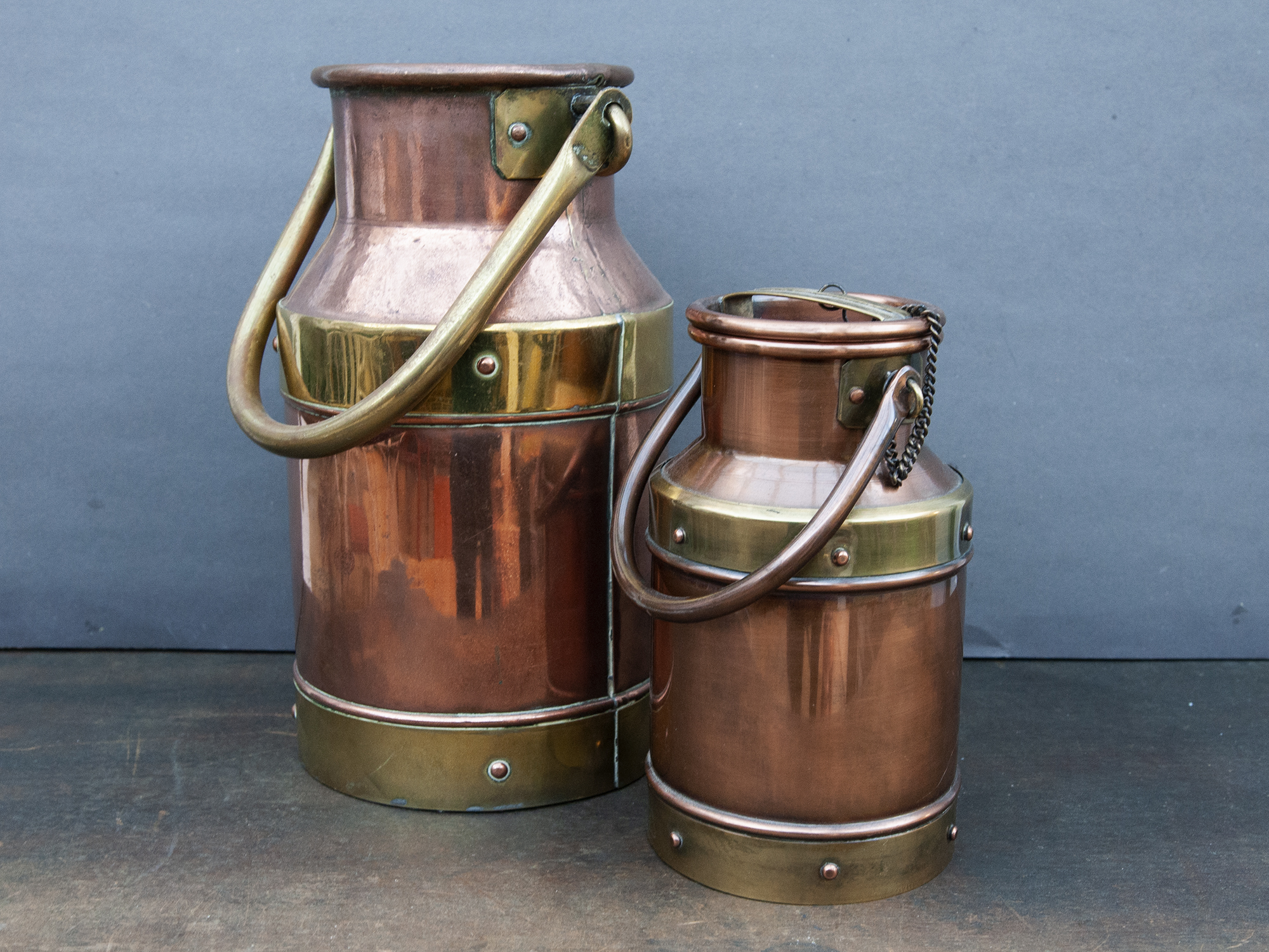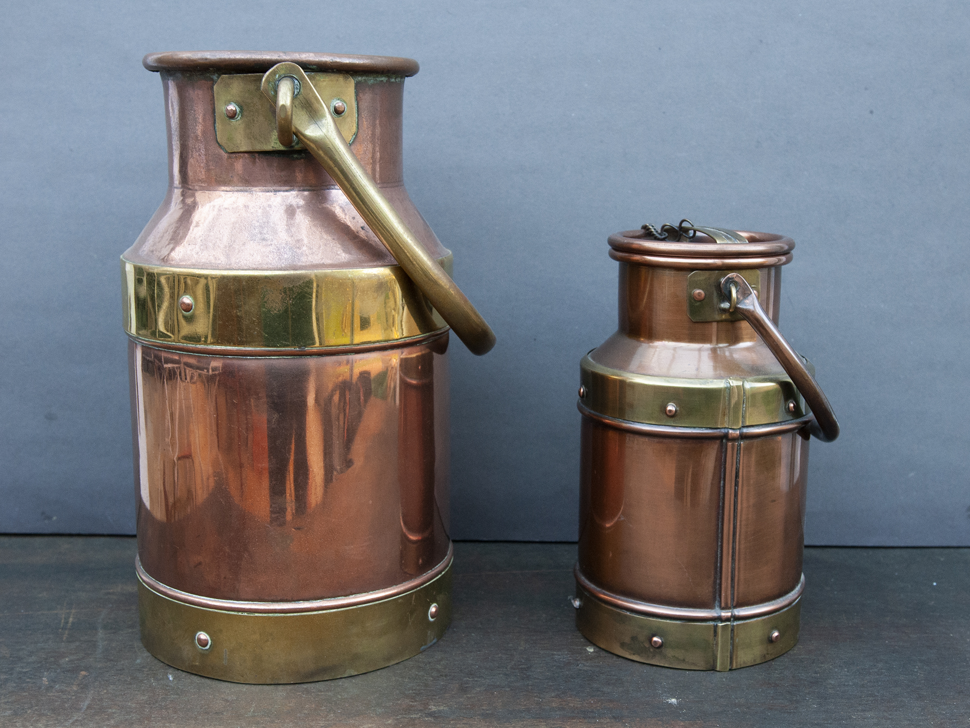 Both milk cans show a beautiful aged patina and may present small dents, surface marks, light stains, or minor imperfections consistent with handcrafted copper and age. The larger milk can does not have its lid.