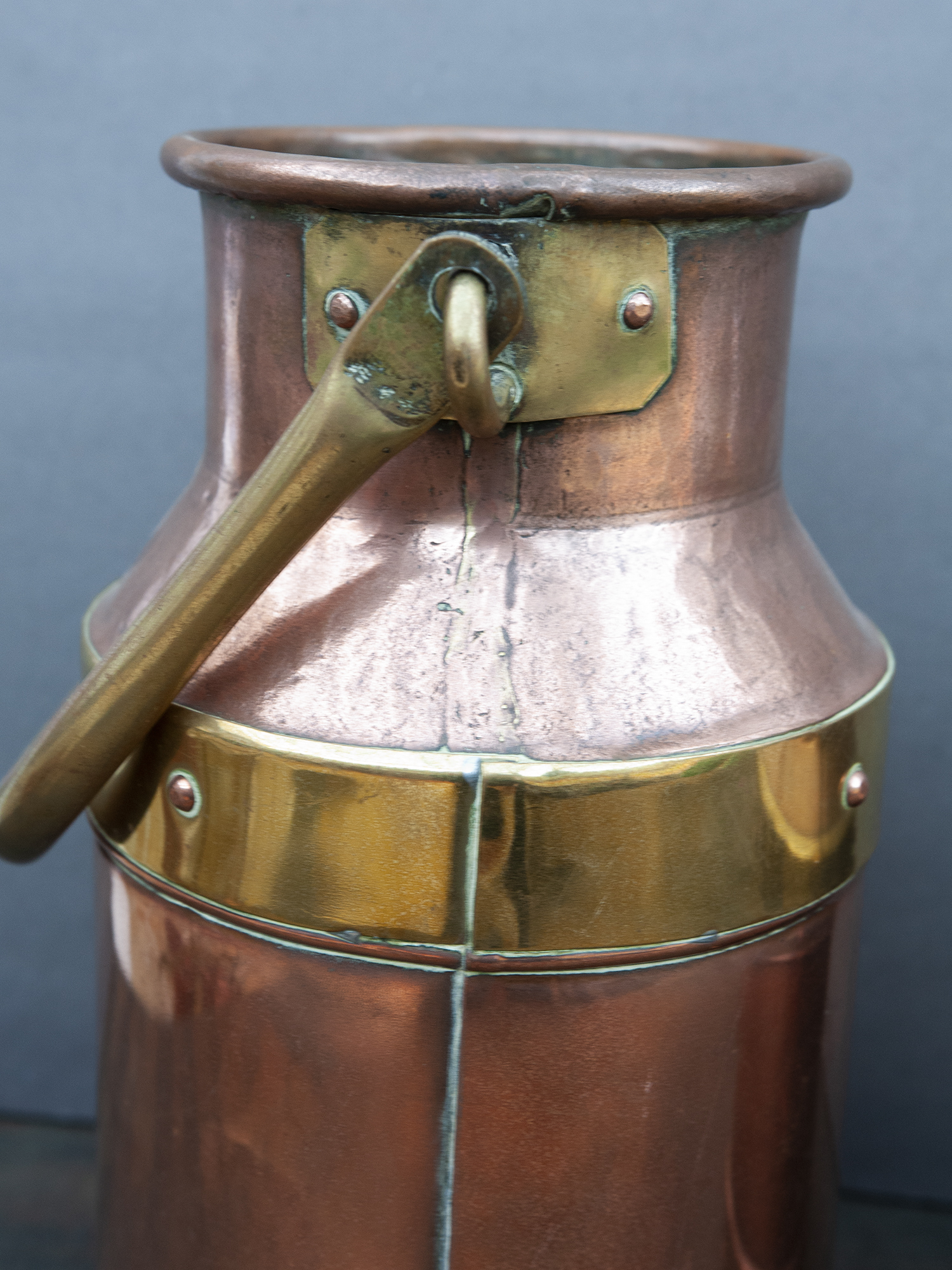 These two handcrafted copper milk cans feature a beautiful bicolor design, combining warm red copper with golden brass accents.