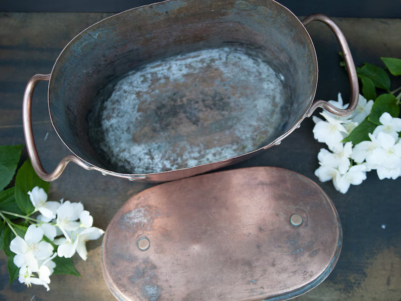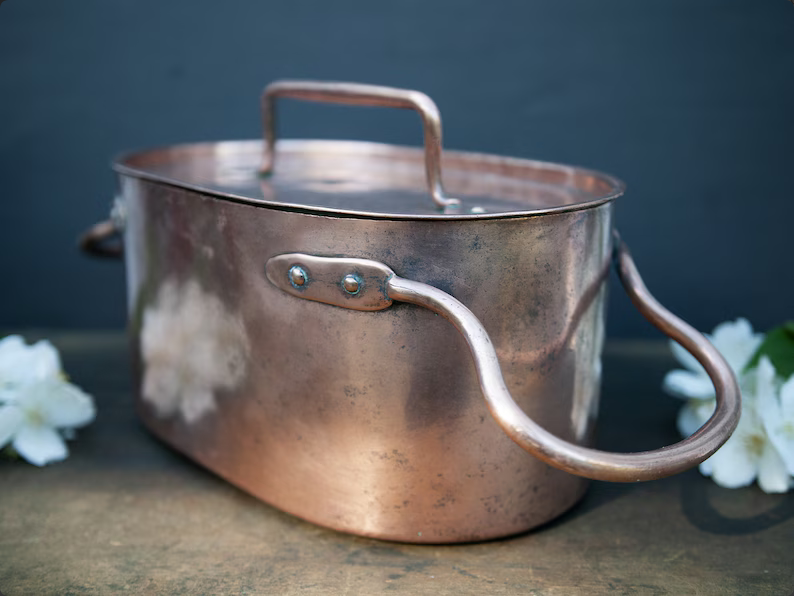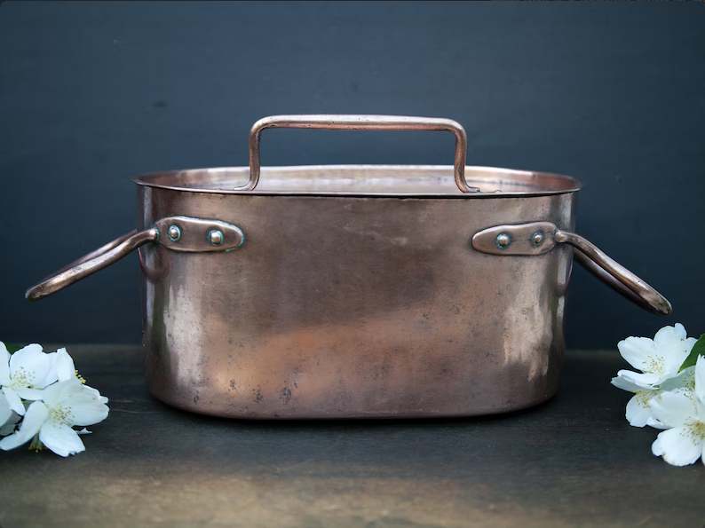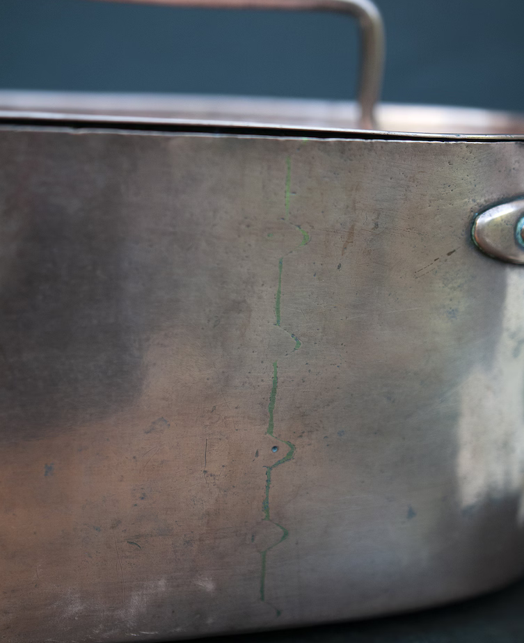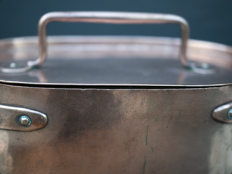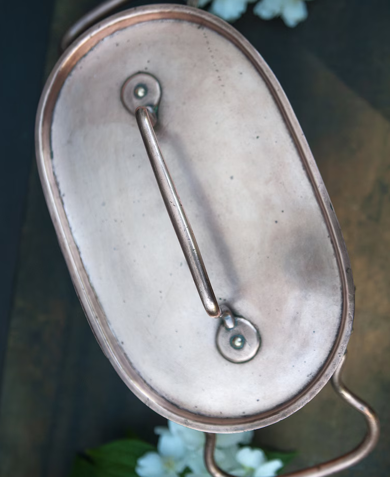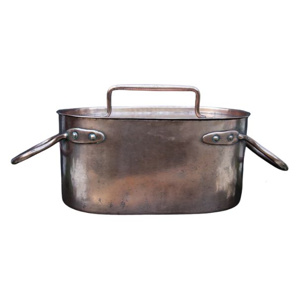 Gorgeous large and heavy copper French daubière, with its lid and two riveted copper handles.