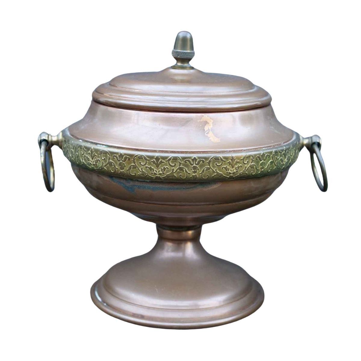 ♥ DESCRIPTION: Vintage mini pedestal bowl or soup tureen in French copper from Villedieu – Gaor. A stunning piece with a lid, a beautiful golden frieze and two handles. It dates from 1950’s. ♥ CONDITIONS: very good, it has been left with patina and shows some oxidization traces (refer to photos). ♥ DIMENSIONS: 6.5 x 6″ /// 17 x 15,5 cm (Height x Diameter) ♥ WEIGHT: 1.9 lbs /// 0.85 kg