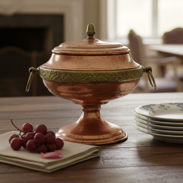 โฅ DESCRIPTION: Vintage mini pedestal bowl or soup tureen in French copper from Villedieu – Gaor. A stunning piece with a lid, a beautiful golden frieze and two handles. It dates from 1950’s. โฅ CONDITIONS: very good, it has been left with patina and shows some oxidization traces (refer to photos). โฅ DIMENSIONS: 6.5 x 6″ /// 17 x 15,5 cm (Height x Diameter) โฅ WEIGHT: 1.9 lbs /// 0.85 kg
