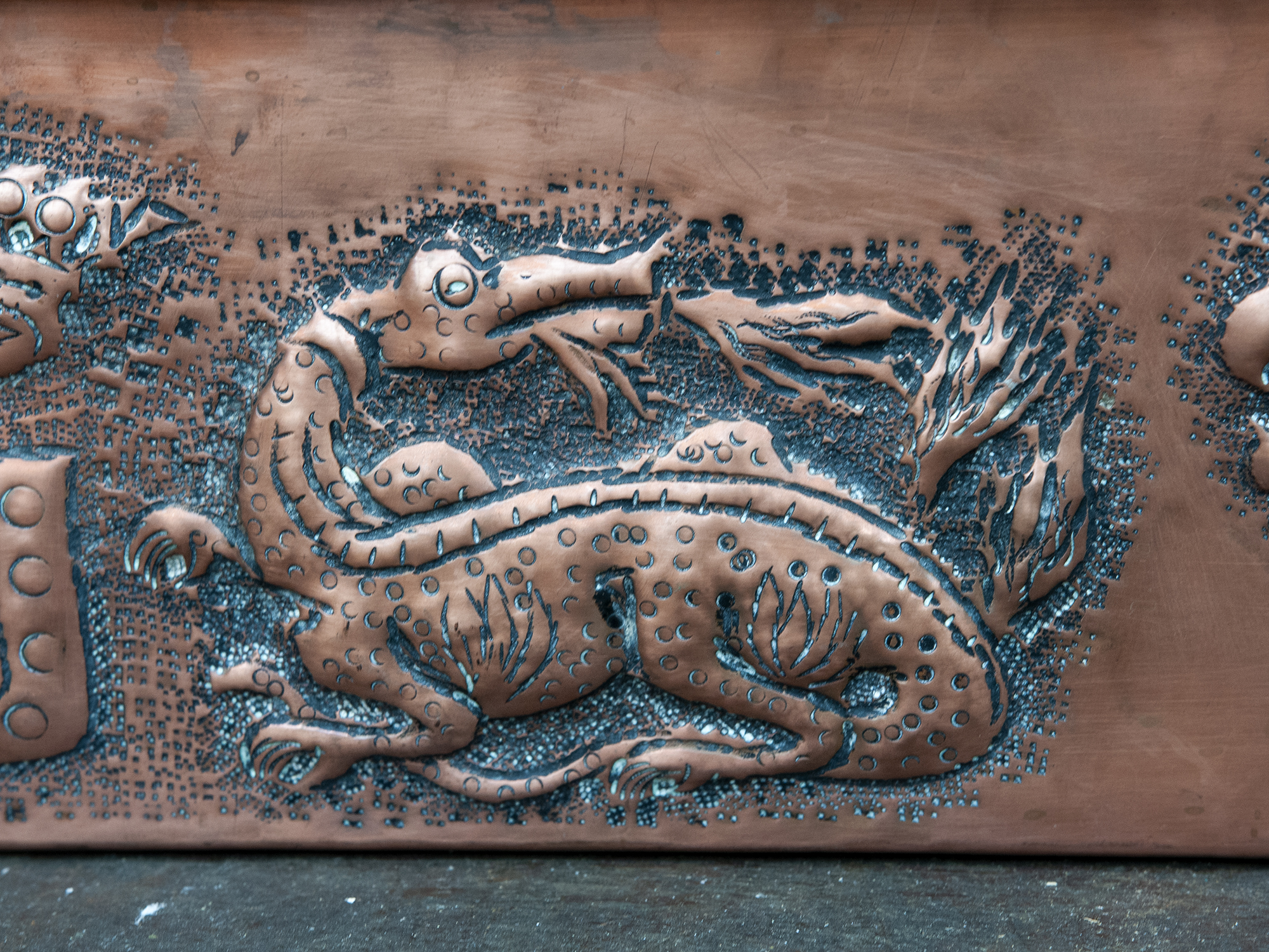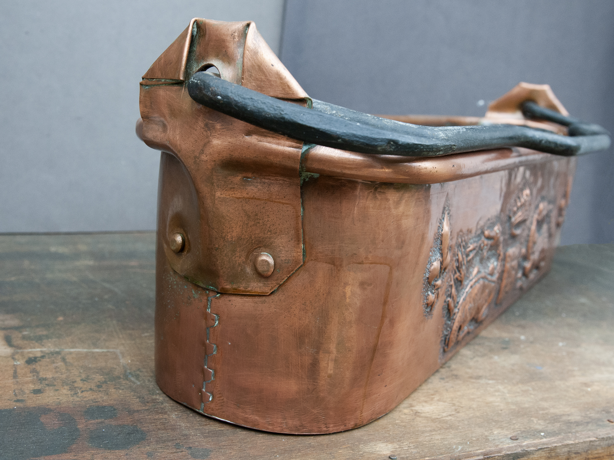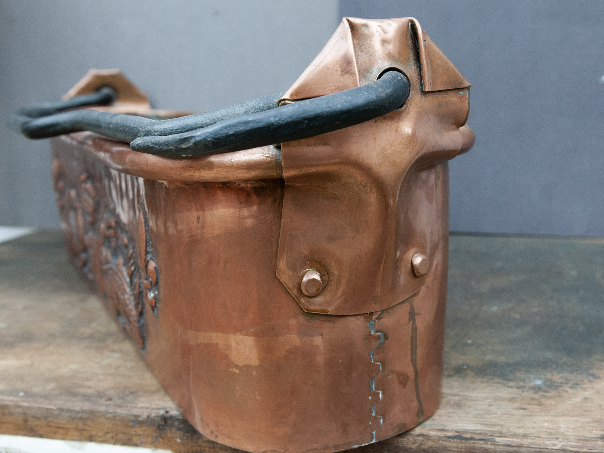 Antique French Copper Fish Poacher with Repoussé Dragons – Large Embossed Vintage PlanterAvailability: In stock