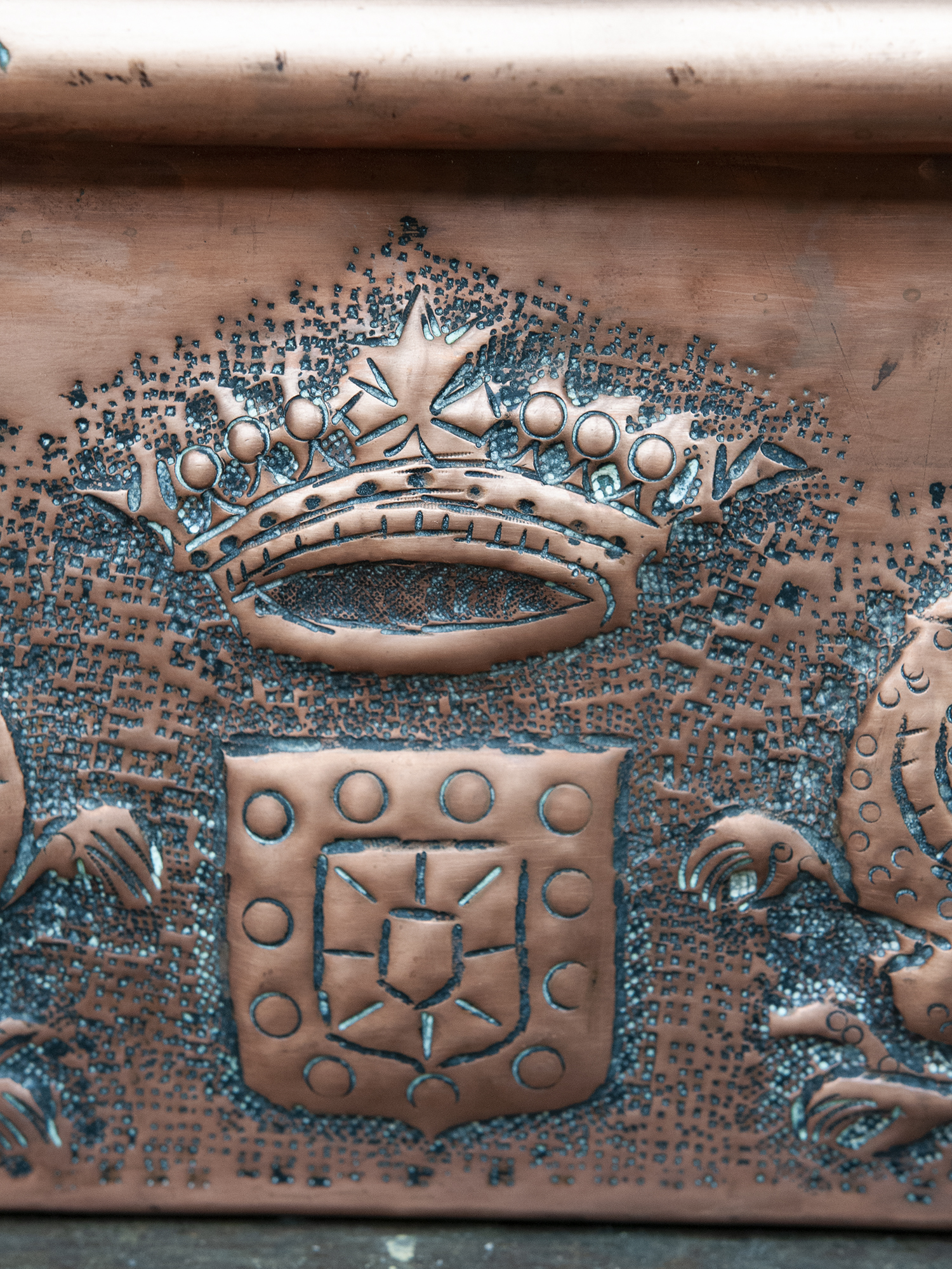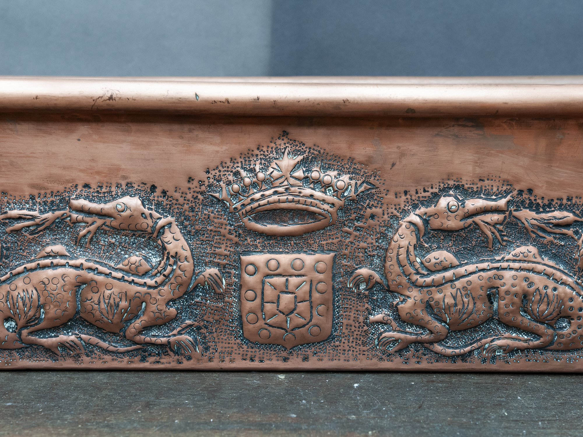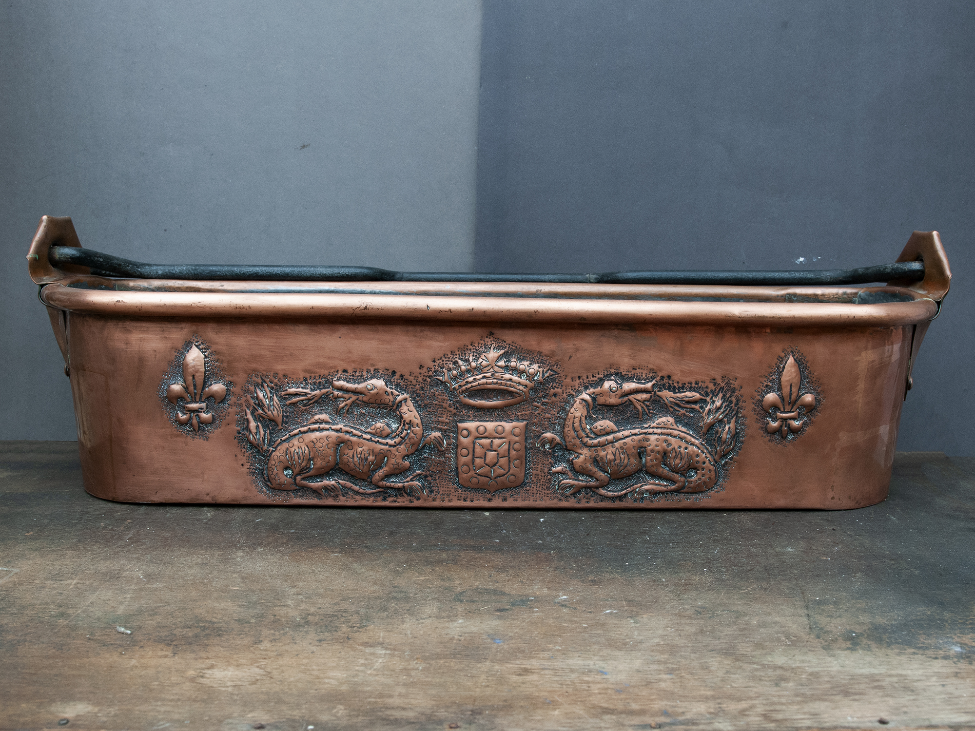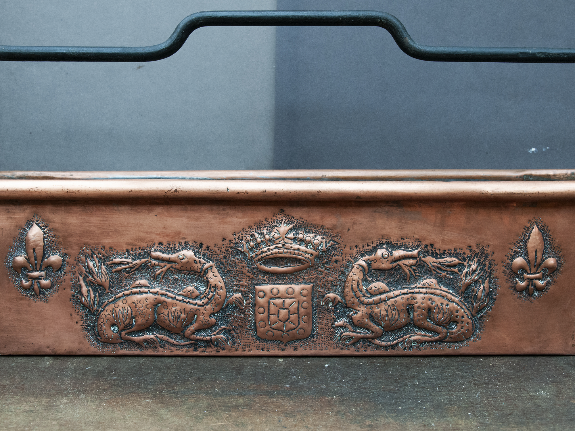 The copper body is richly decorated on both sides. One side features an elaborate heraldic composition with two repoussé dragons facing a central shield topped with a crown, framed by textured punch work. The opposite side displays a rhythmic alignment of fleur-de-lis motifs, deeply embossed and evenly spaced.