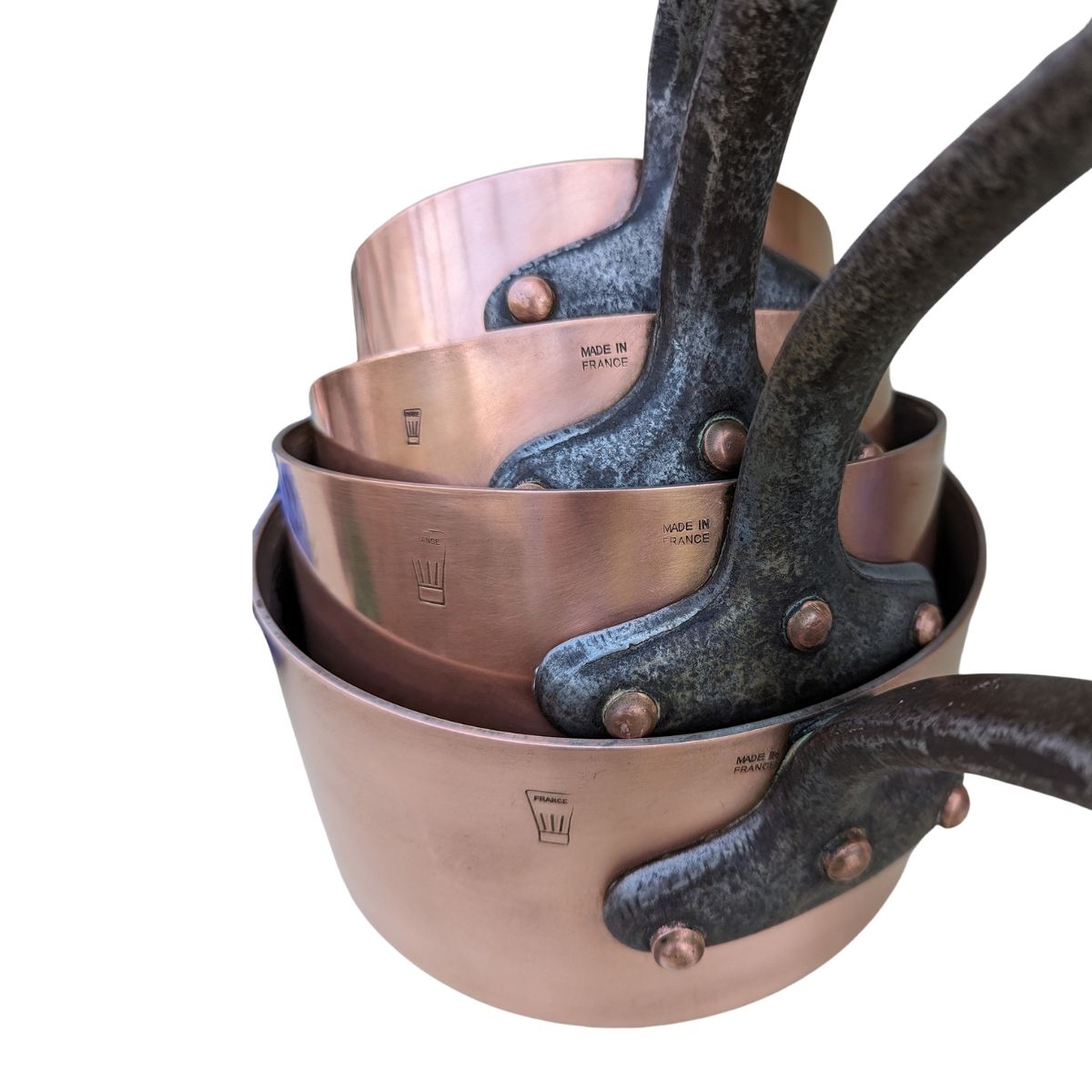 Indulge in the timeless craftsmanship of Mafter with this exceptional set of 4 vintage French copper pans. Each pot proudly bears the “Made in France” mark along with the iconic Mafter logo, a symbol of premium quality and durability. What makes this set truly special is its heavyweight construction and substantial thickness, measuring approximately 1.8 to 2 mm, ensuring optimal heat distribution for precision cooking. Whether you’re an avid collector or a chef seeking authentic French cookware, these pans are a stunning addition to your kitchen. Retinning can restore them for professional use.