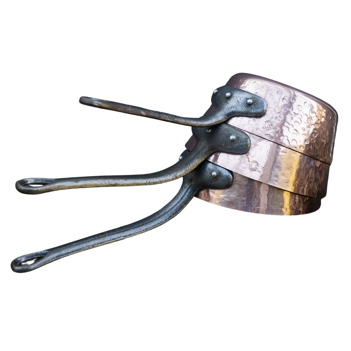 Add a touch of authentic French craftsmanship to your kitchen with this set of 3 vintage hammered copper saucepans. These high-quality, French-made pans feature riveted cast iron handles and a tin-lined interior in very good condition, making them ideal for cooking. The two larger pans are the same size, making this a rare and balanced set. Stamped “Fabrication française”, they are a beautiful addition to any French country or rustic kitchen.