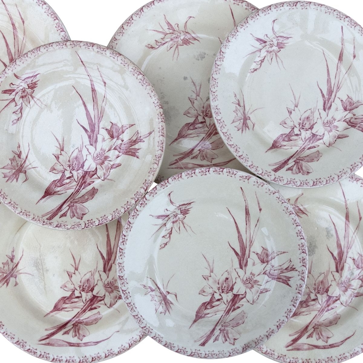 Set of 7 Vintage French GIEN Pink Transferware Plates – “Glaïeul” PatternAvailability: In stock