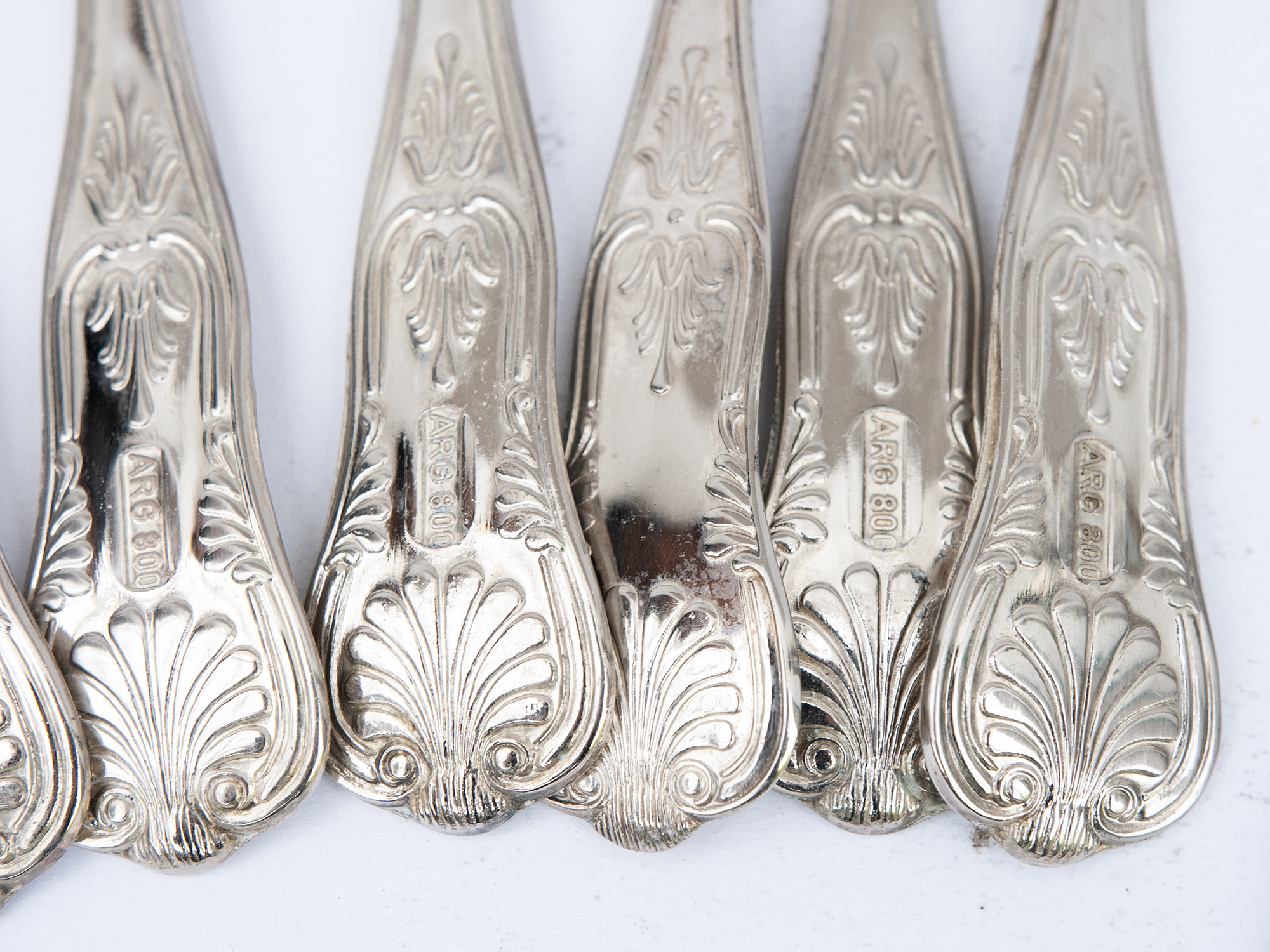 The flatware is silver plated metal marked ARG 800, which means the silver alloy contains 800 parts of silver per 1000, a traditional European standard known for its durability. The knife blades are stainless steel, practical for daily use.