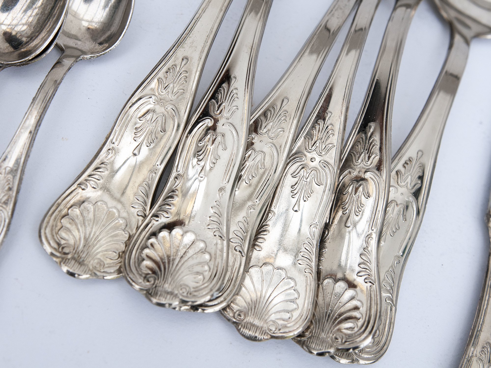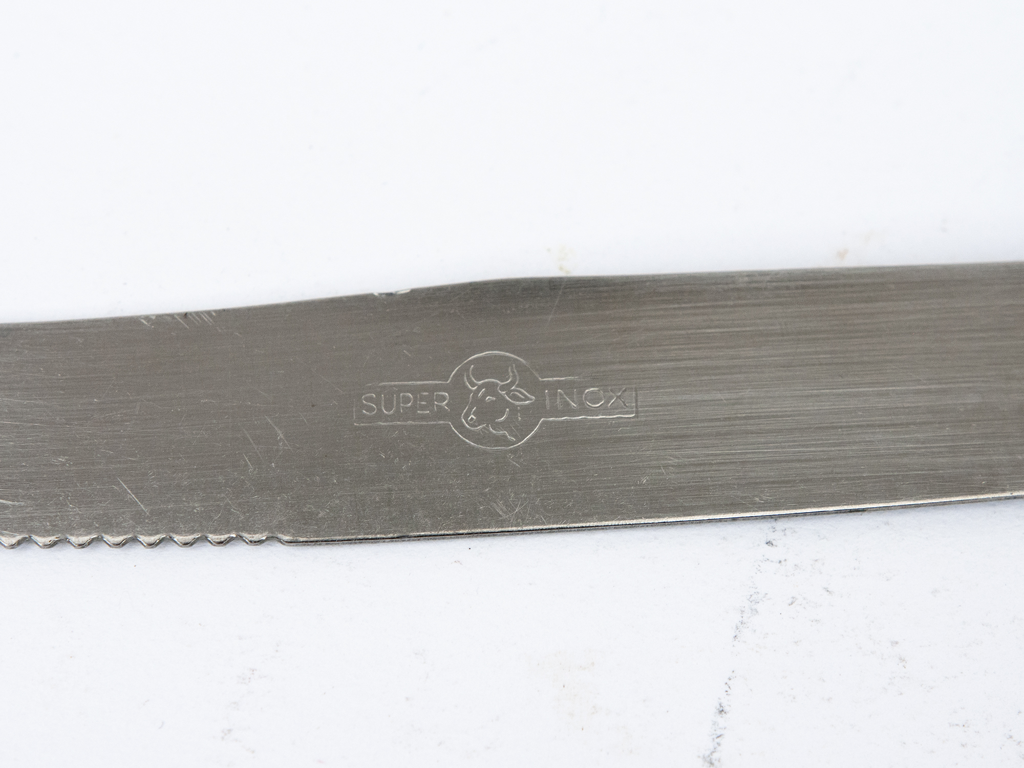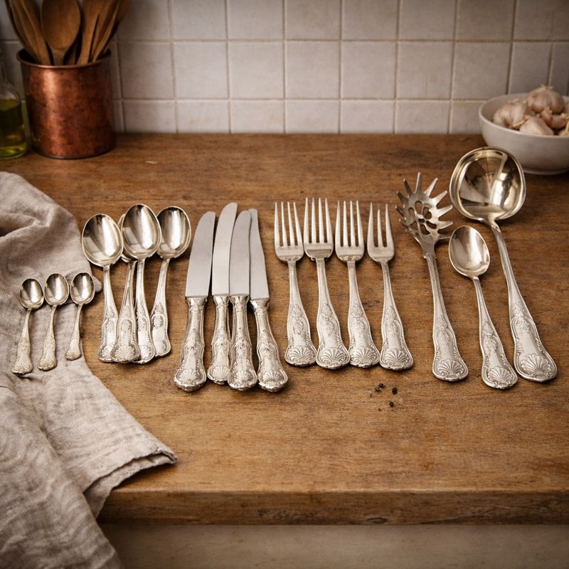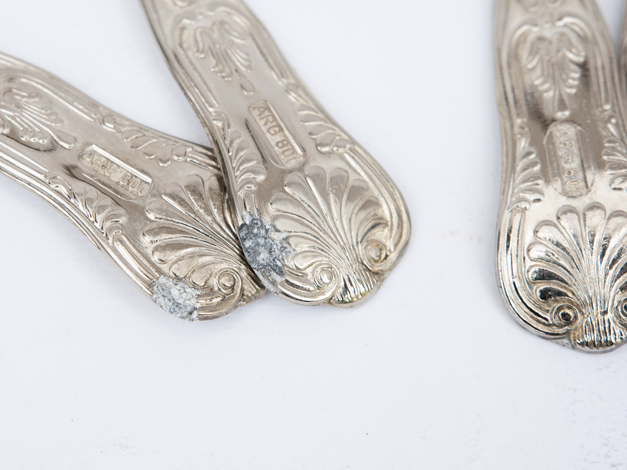 This is a well-loved vintage set. It shows gentle patina, fine surface scratches, and small imperfections consistent with age and use. Two tablespoons have light limescale deposits, and one tablespoon and one serving utensil are not stamped ARG 800. These details are part of the authenticity of the set.