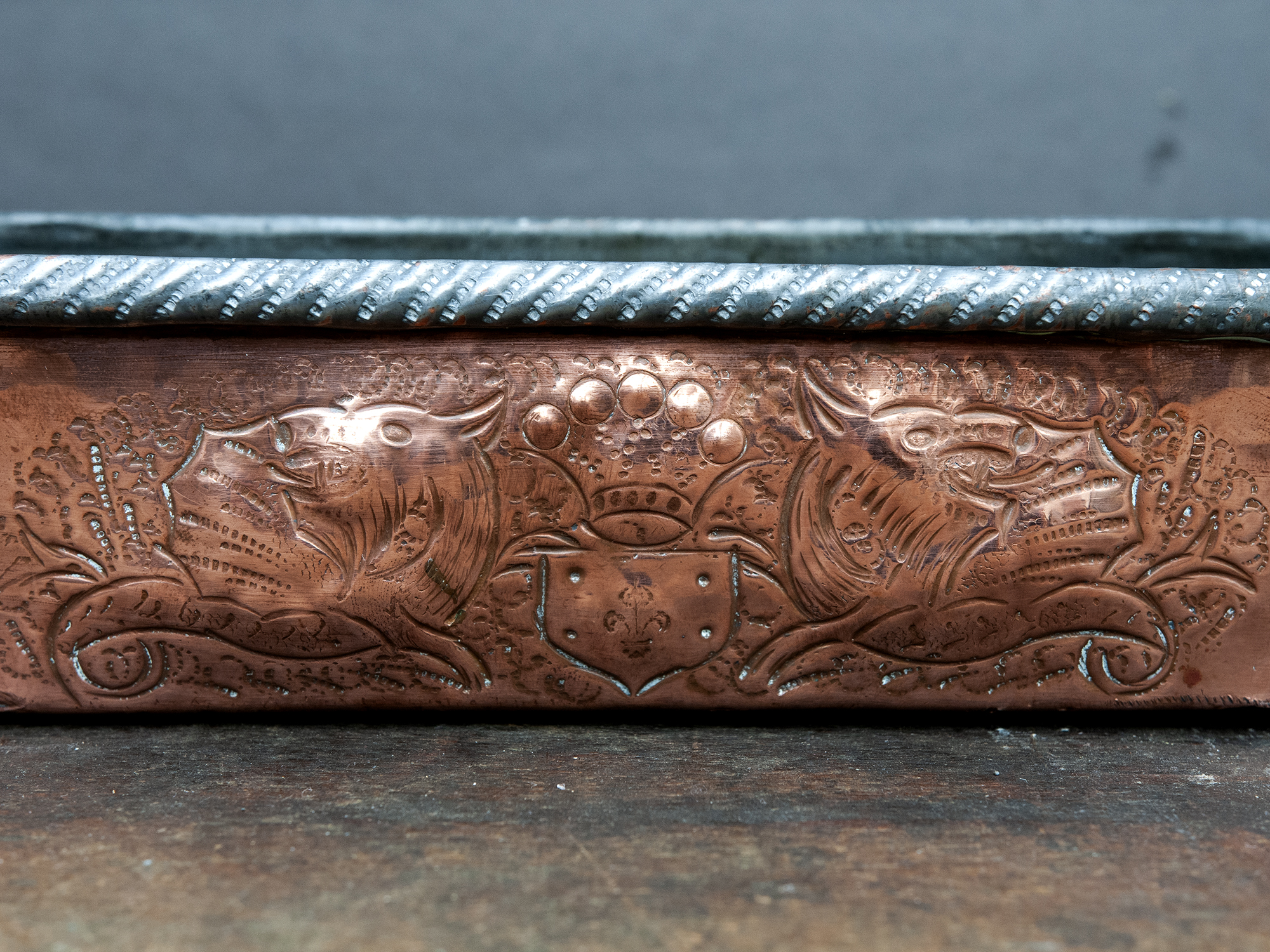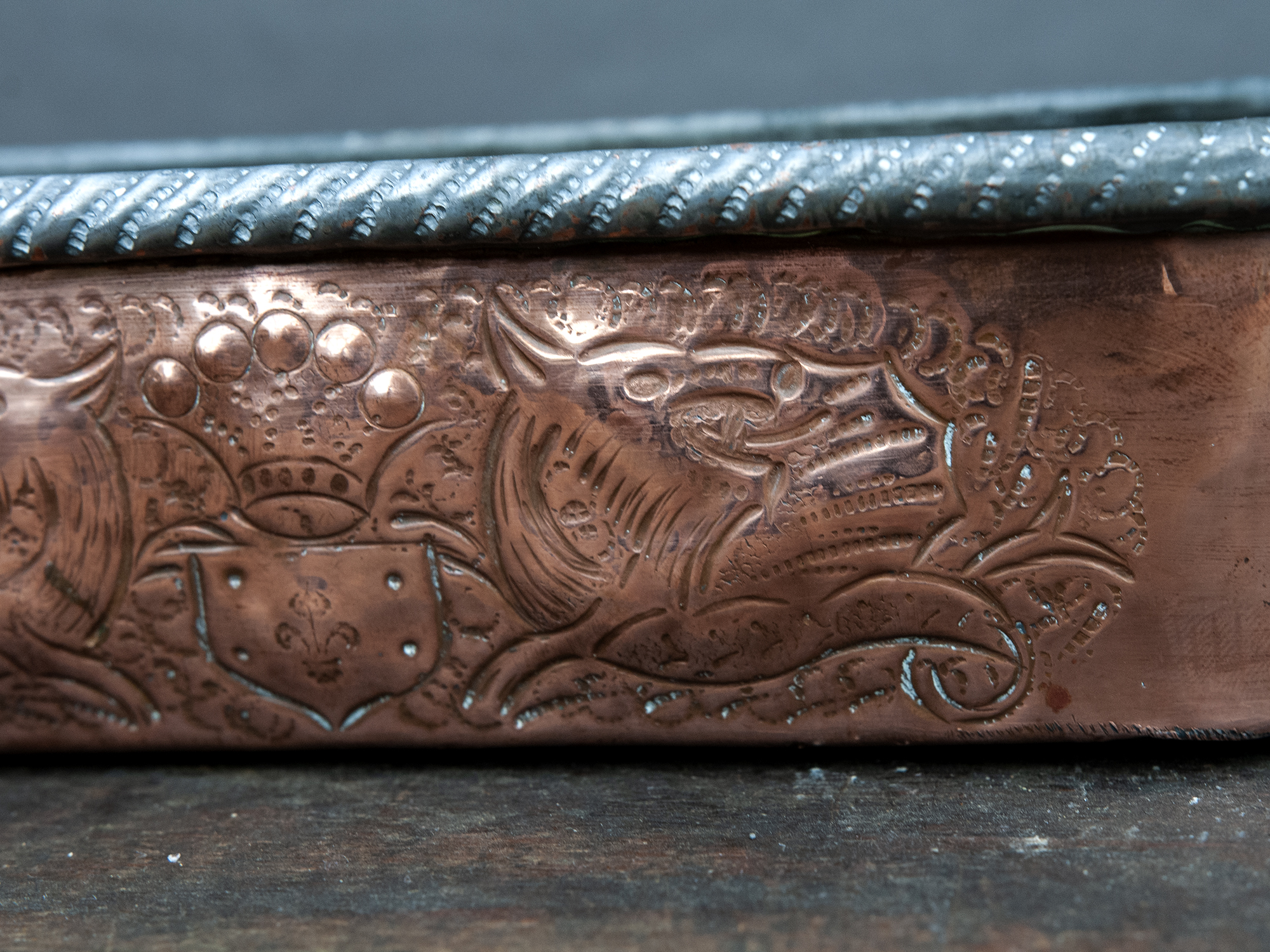 The copper body is richly decorated with raised dragon motifs, finely chased and framed by scrolling foliage. At the center, a heraldic shield adds a strong decorative focal point. The detailing is clearly hand-worked, with no two lines perfectly identical.