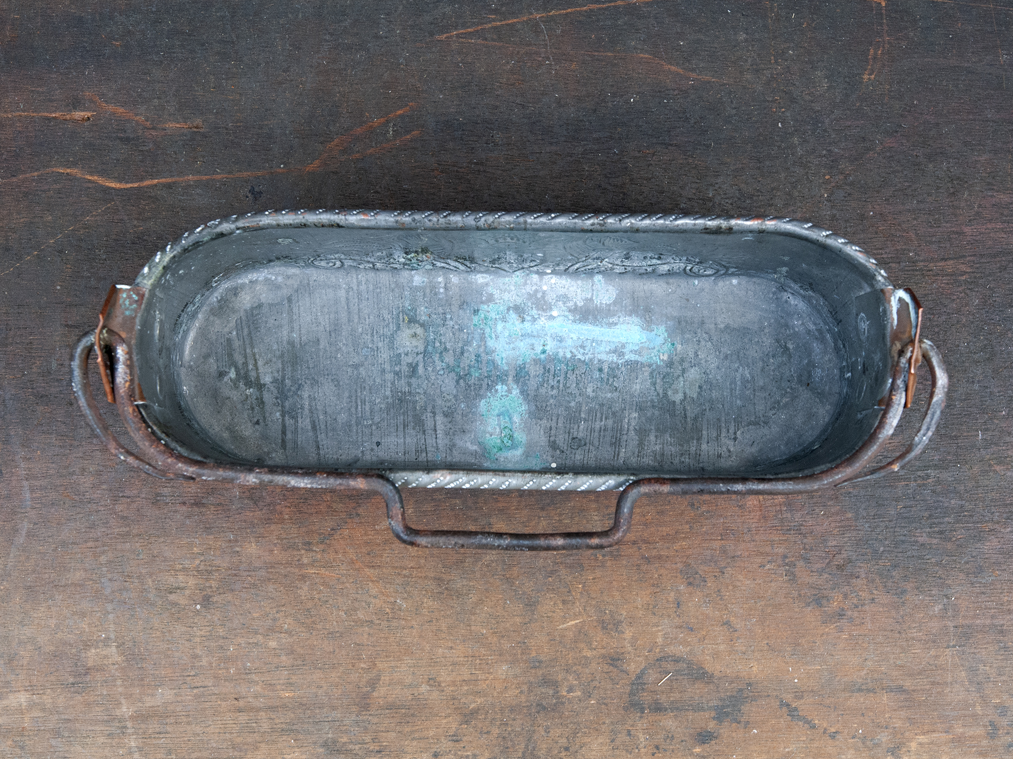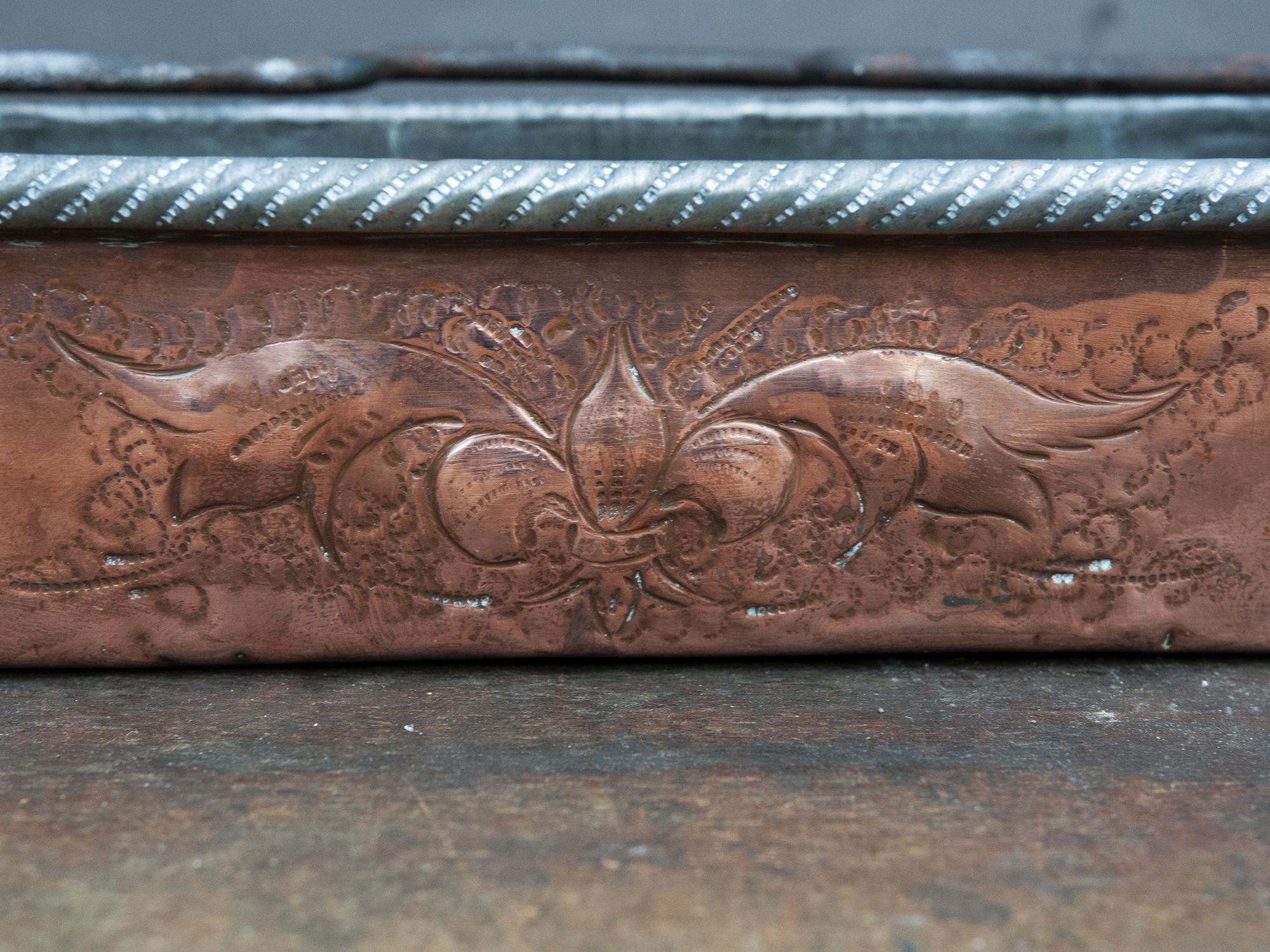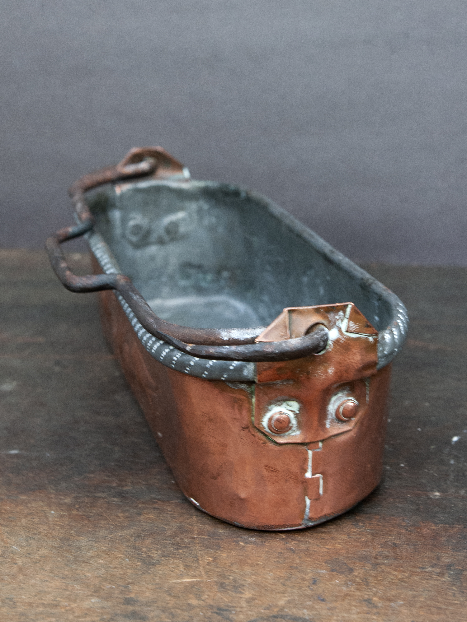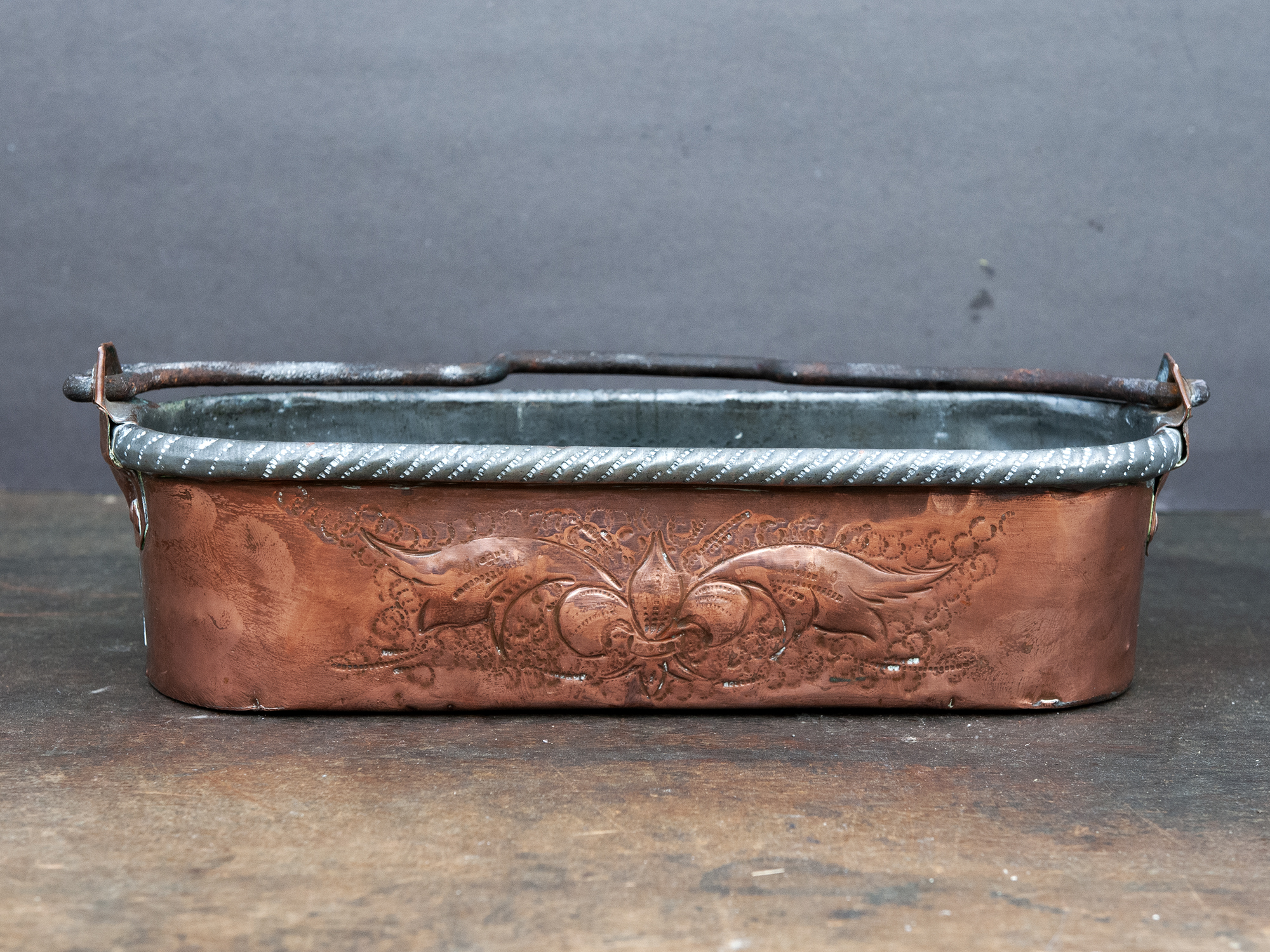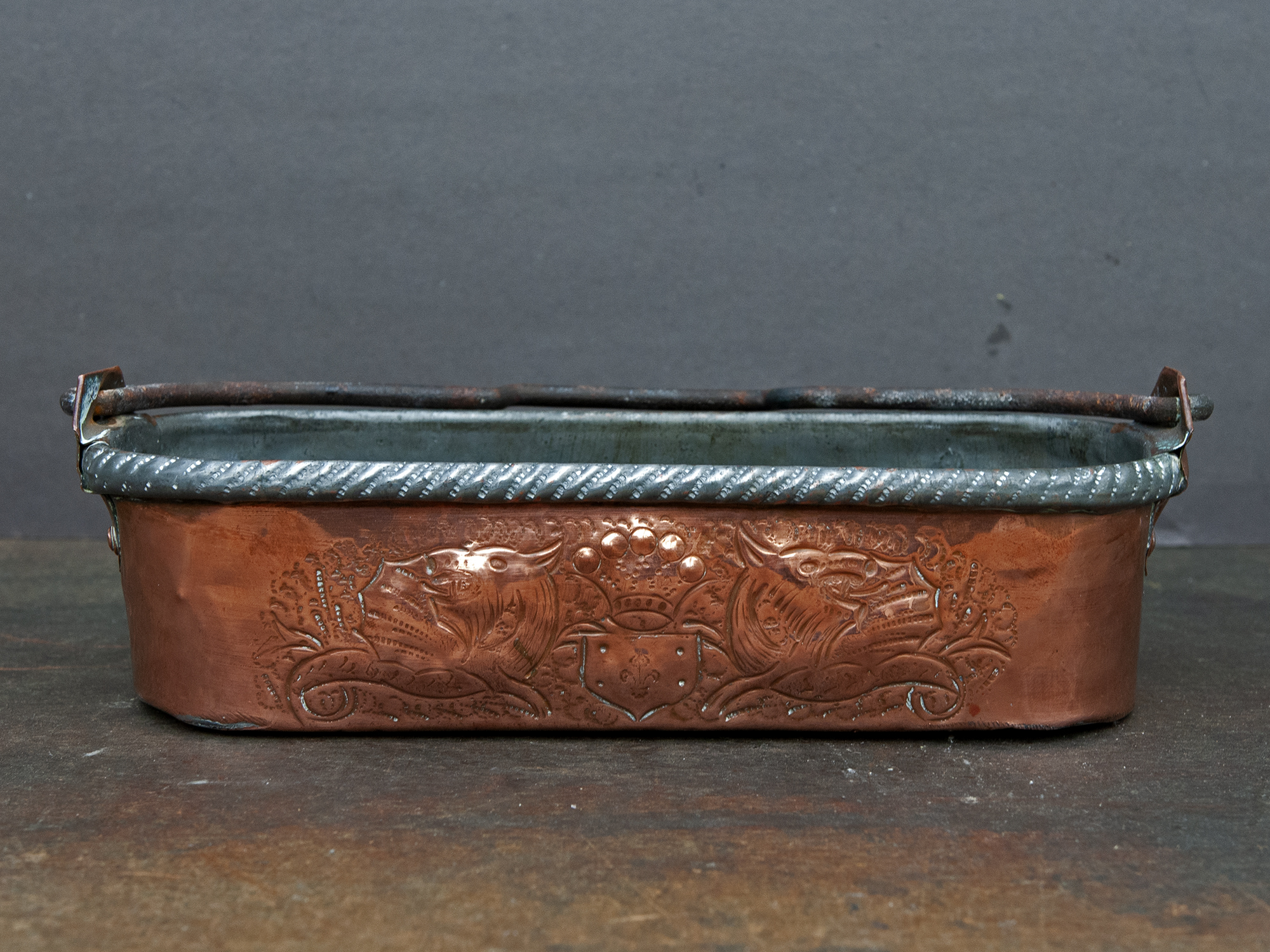 Small Antique Copper Fish Poacher with Dragons – French Embossed Copper Planter
