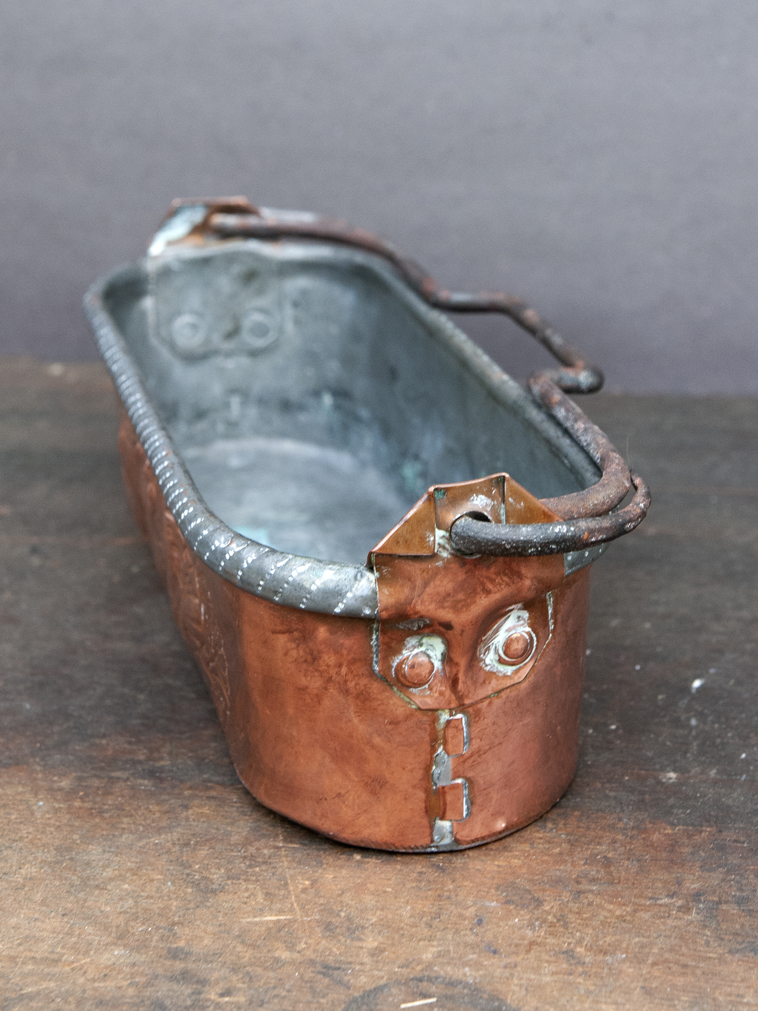 Rare small antique copper fish poacher with hand-hammered dragon motifs and aged patinaSmall Antique Copper Fish Poacher with Dragons – French Embossed Copper Planter
