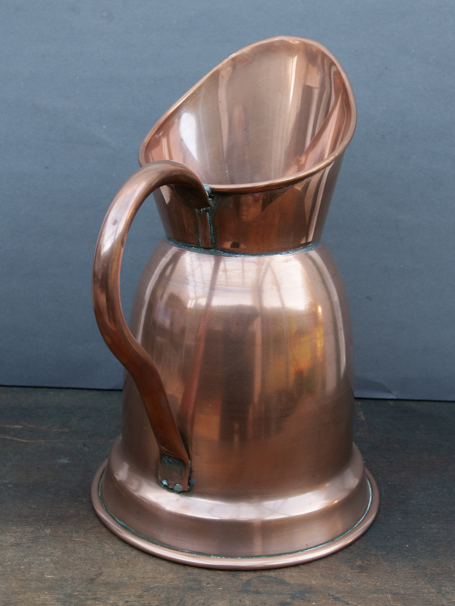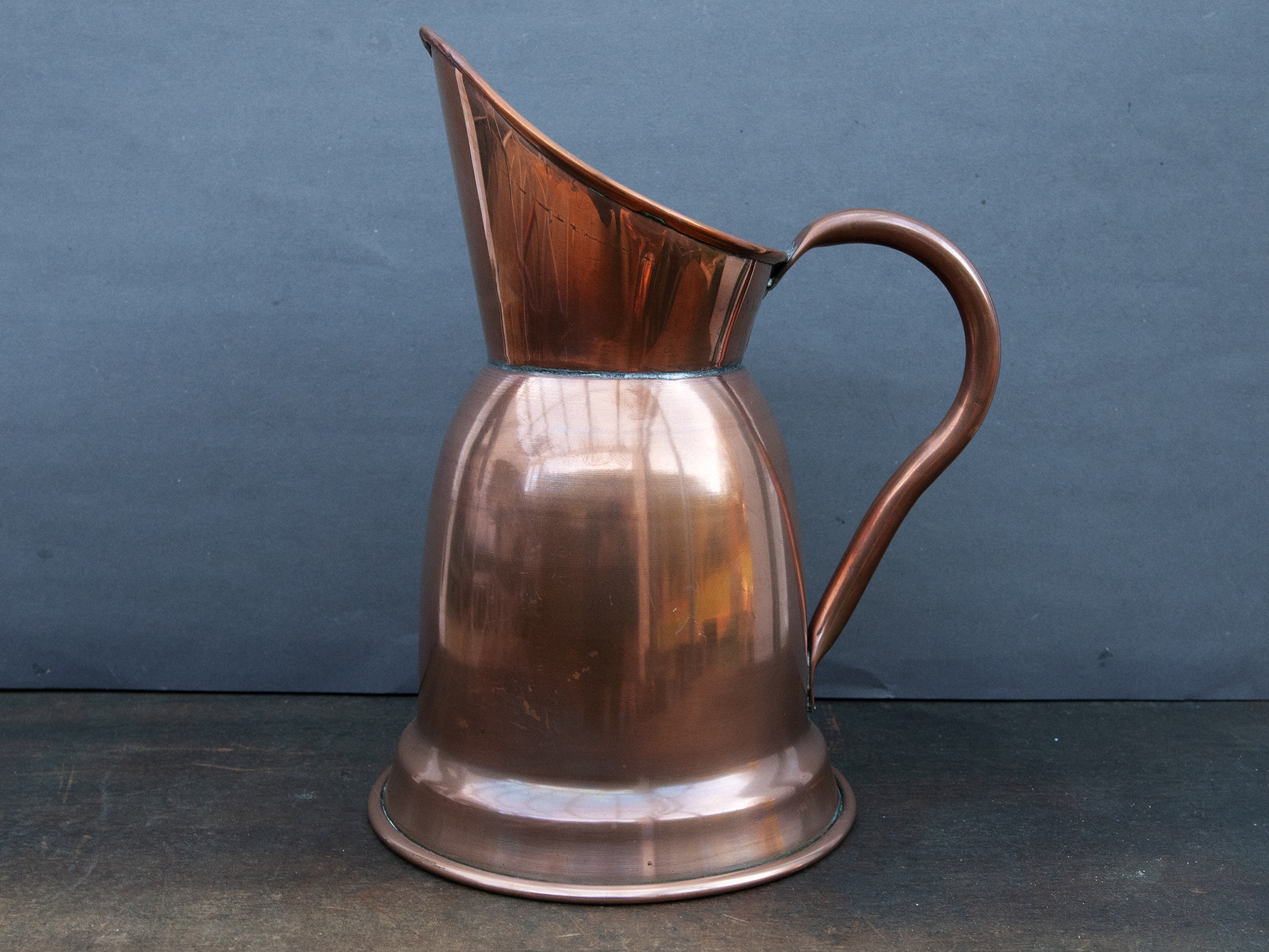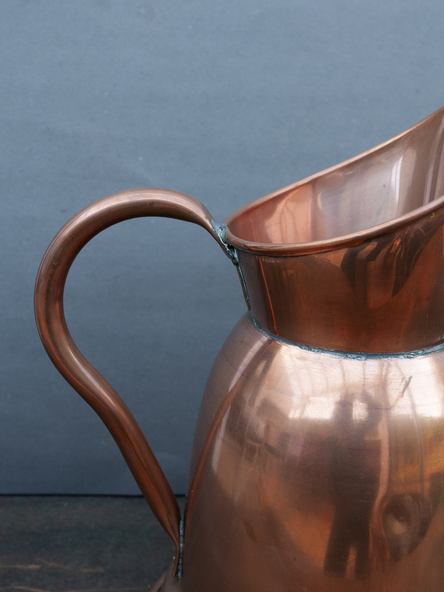 The copper has developed a natural patina over time. The interior is darkened, and the pitcher is best appreciated today as a decorative object rather than a functional vessel.