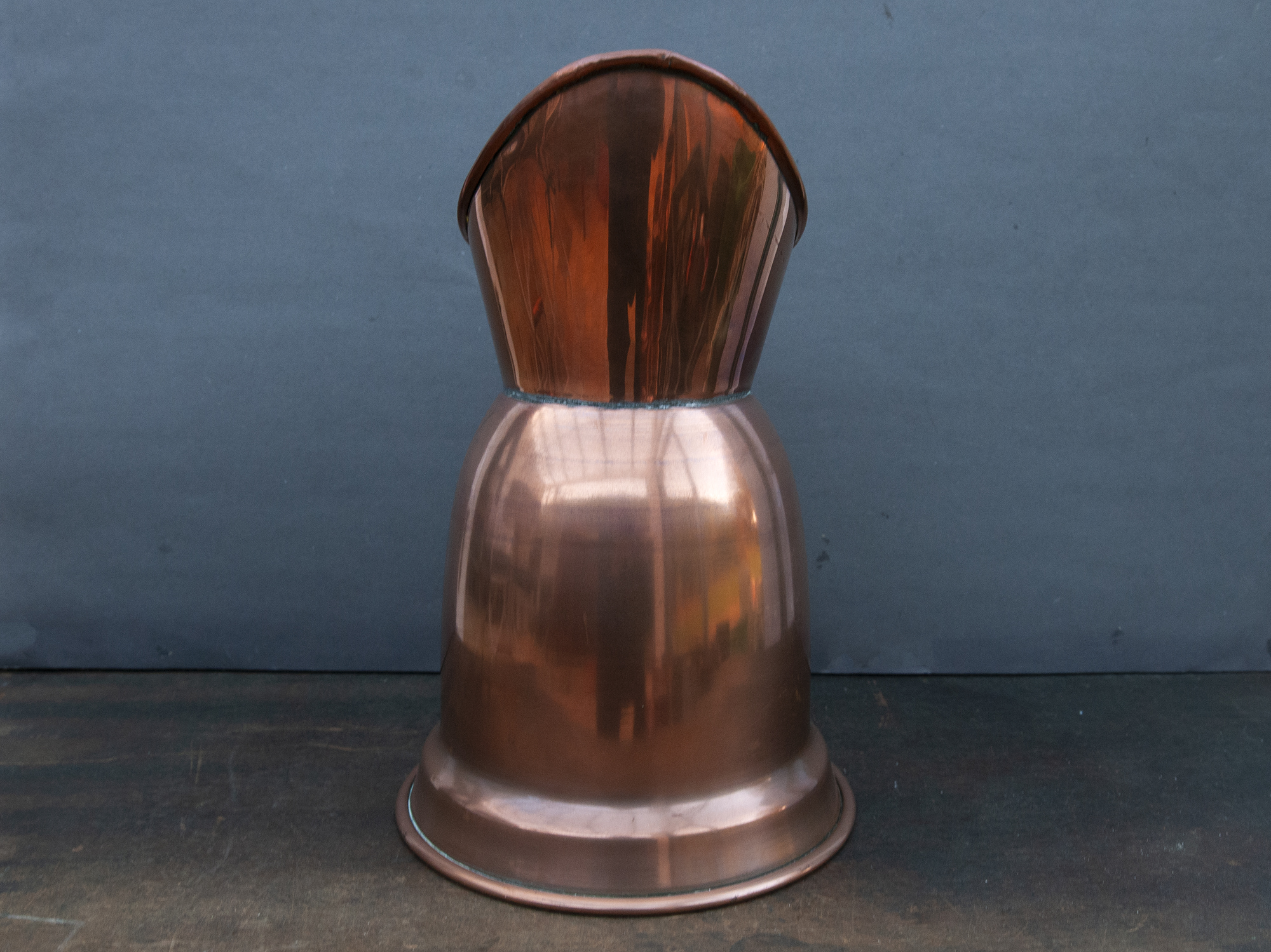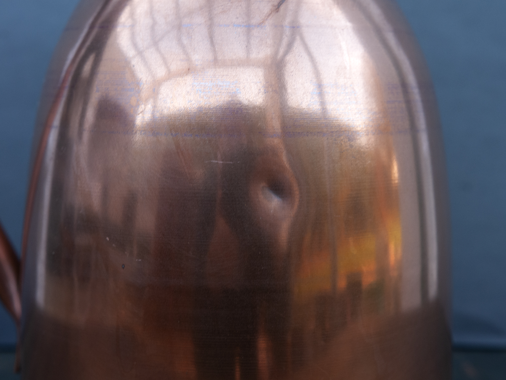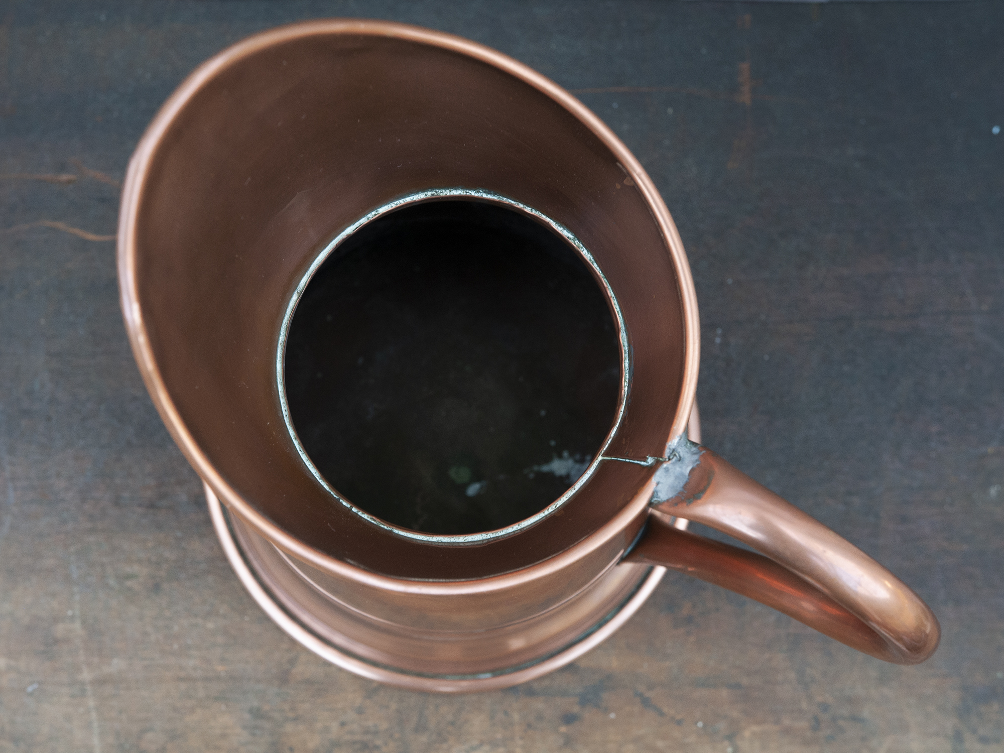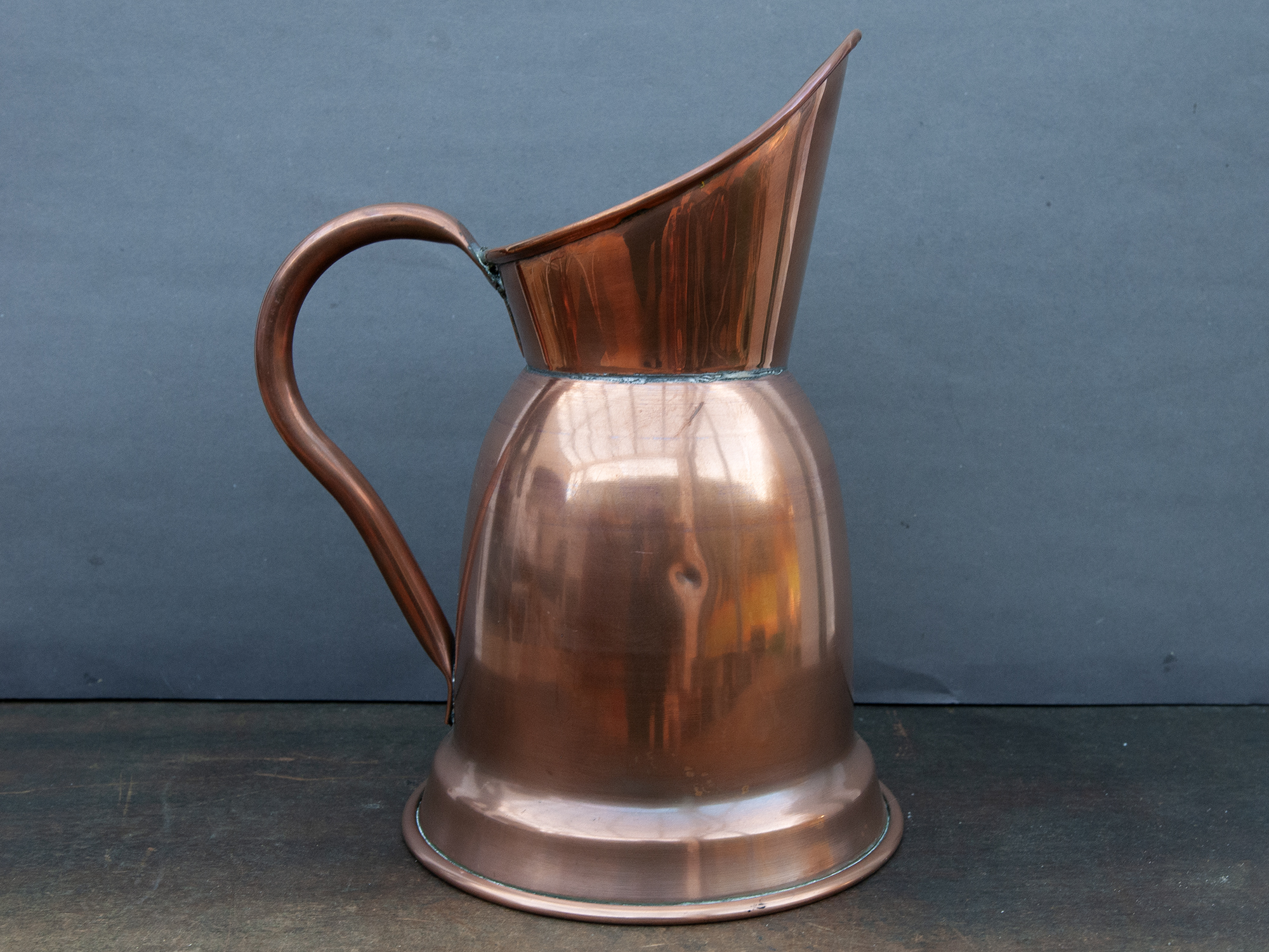 The copper has developed a natural patina over time. The interior is darkened, and the pitcher is best appreciated today as a decorative object rather than a functional vessel.