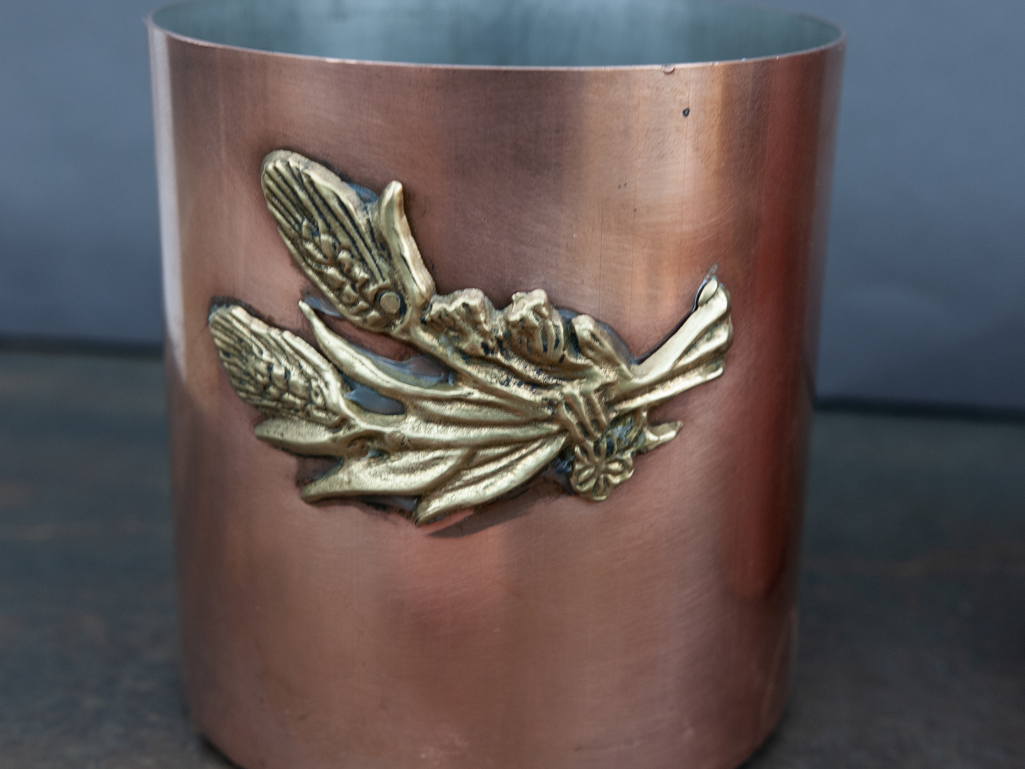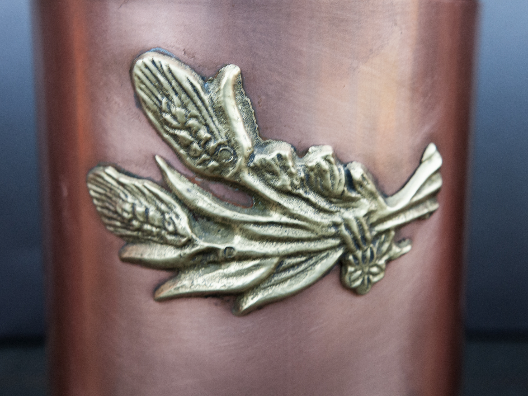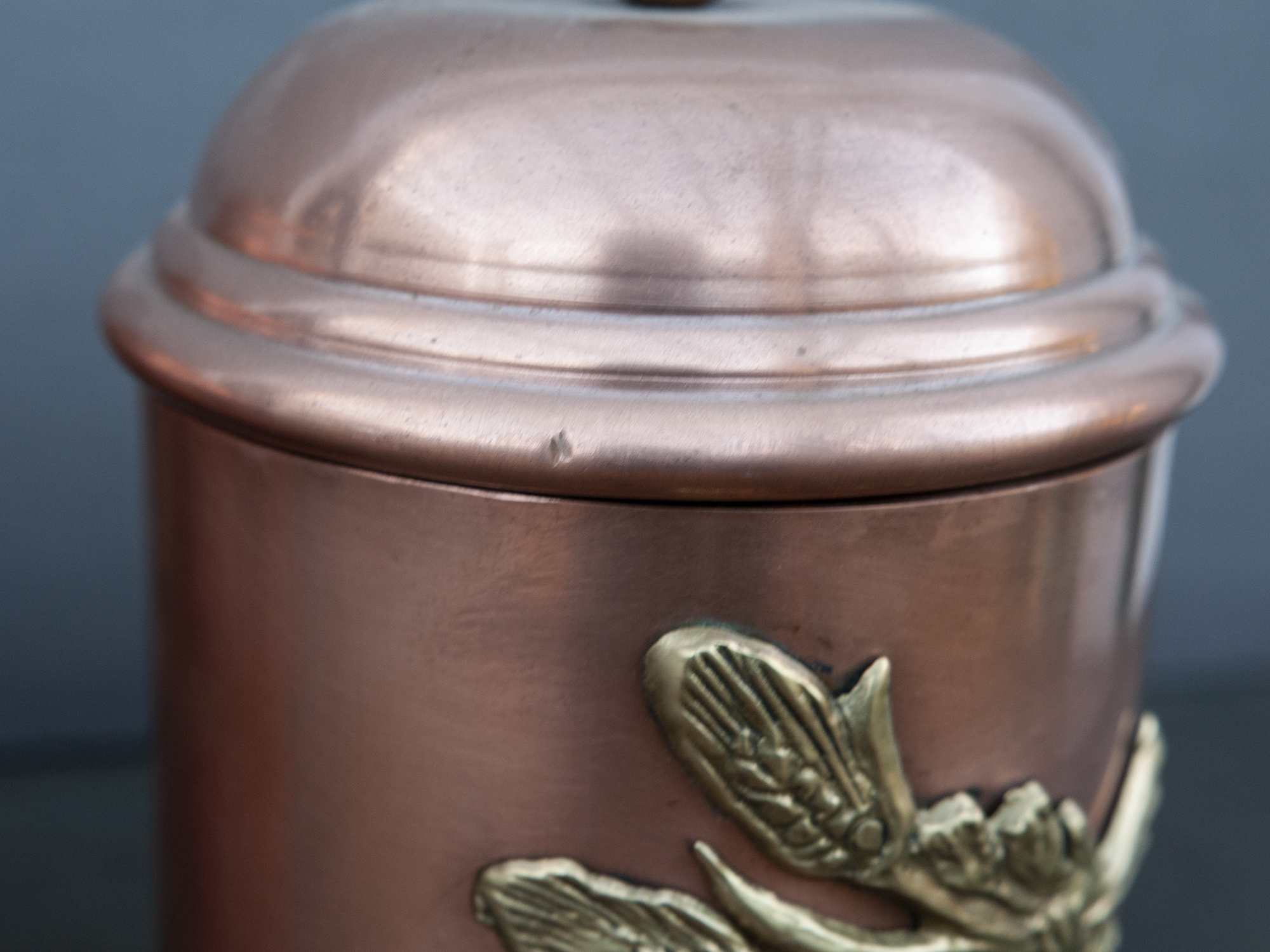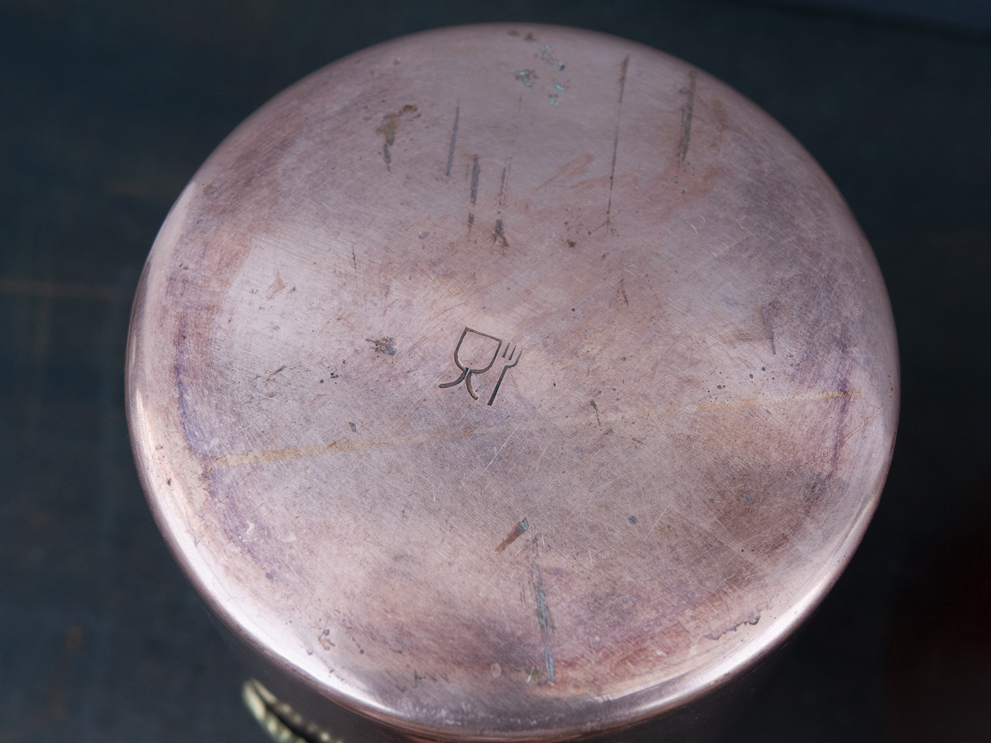 Interior tinning is clean and well preserved with a few small spots. One decorative element was previously reattached and is now firmly secured. One lid screw has been replaced. Two small surface imperfections are visible on the copper.