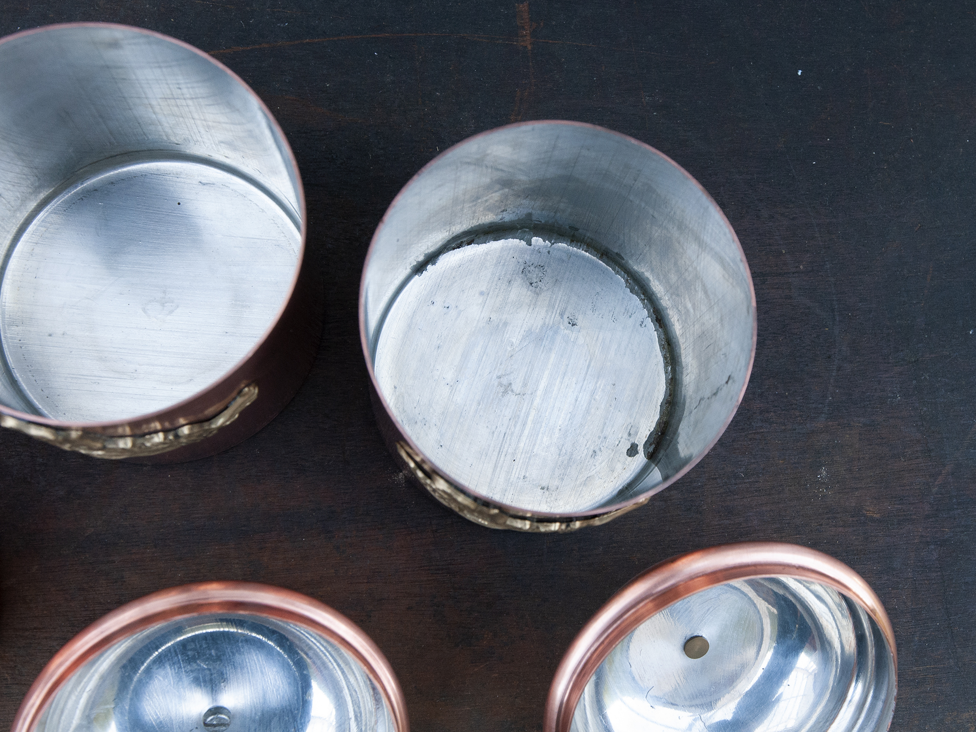 Each piece shows gentle signs of age that tell its story. One decorative motif was carefully reattached by a previous owner and is now securely fixed, with faint traces of adhesive visible upon close inspection. One lid screw has been replaced, without affecting function or appearance. The tinning remains in very good condition, with only a few small marks.