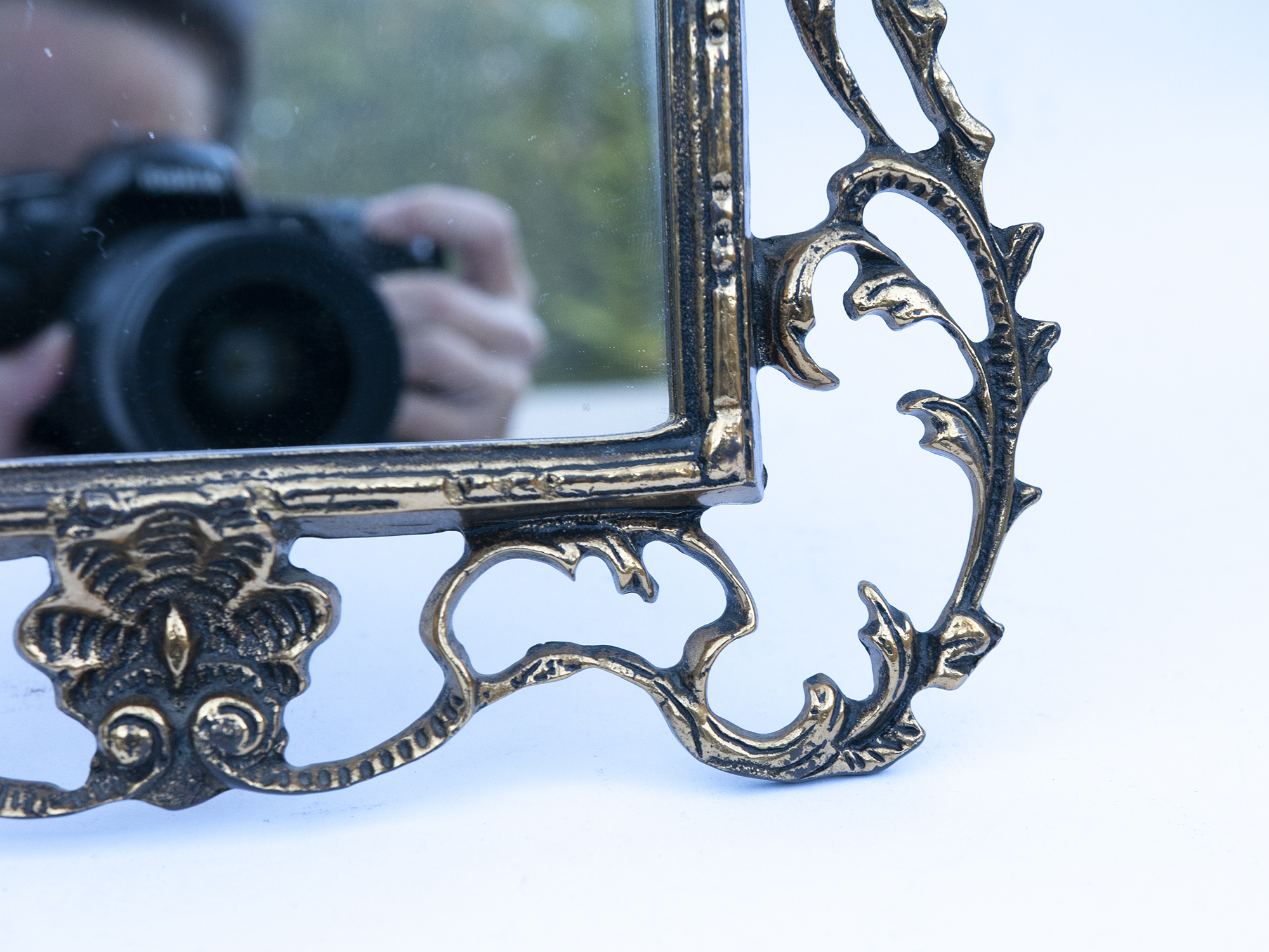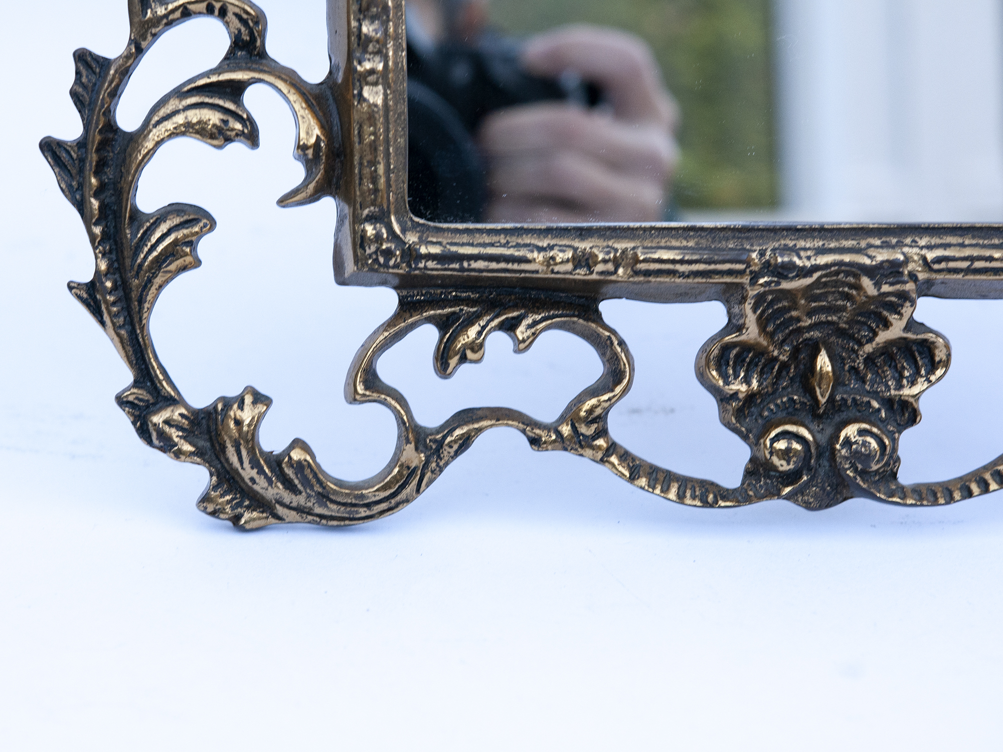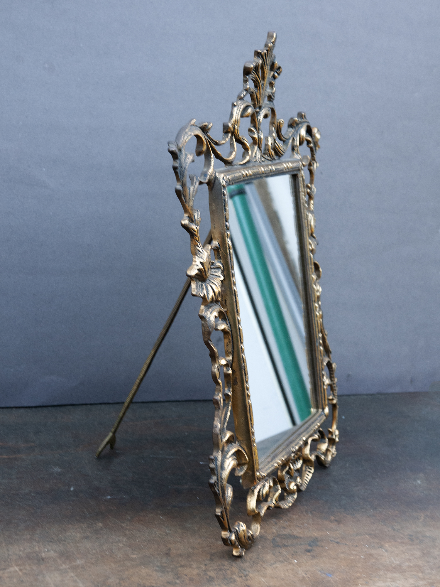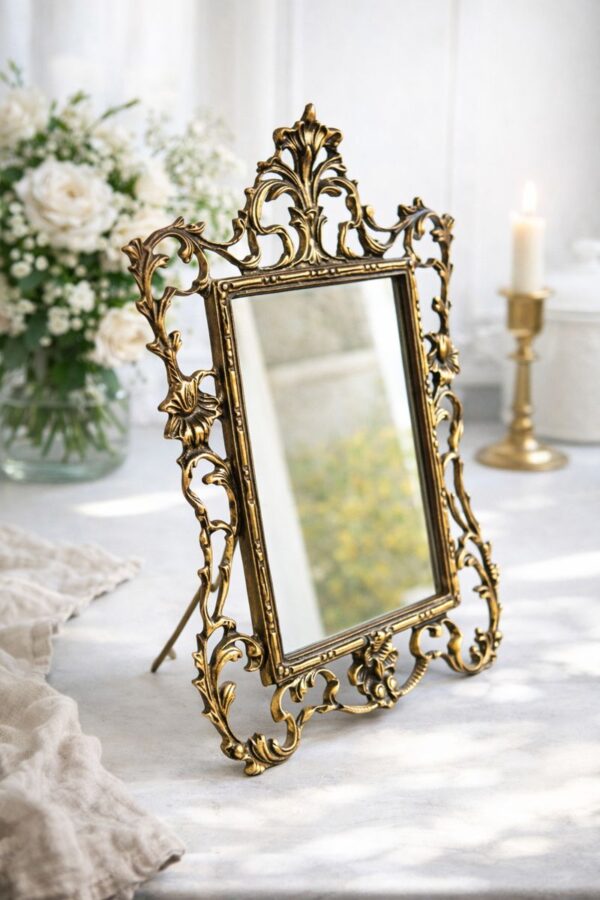 Vintage french brass tabletop mirror styledVintage Brass Tabletop Mirror – Ornate French Rococo Vanity Mirror in Bronze