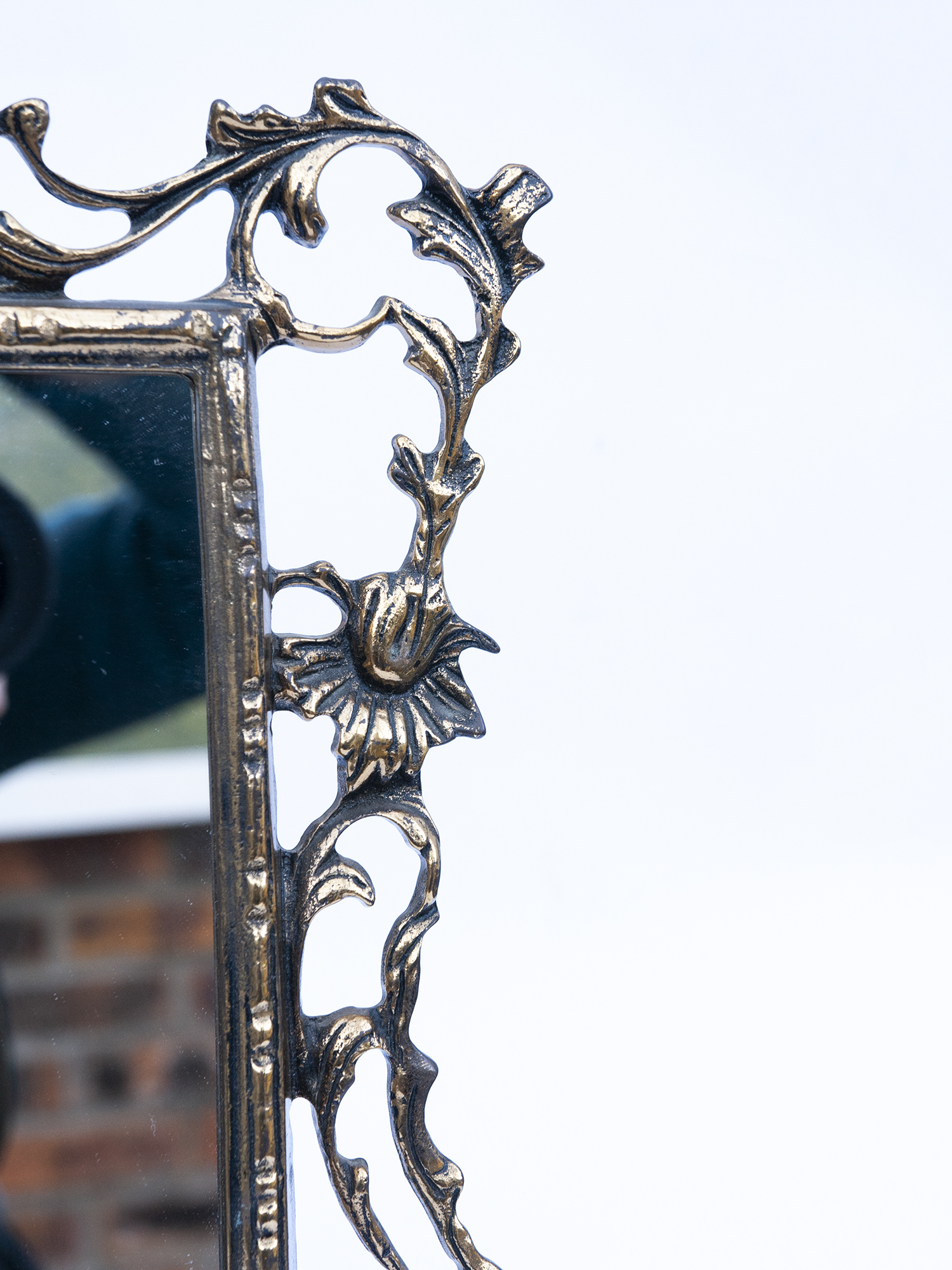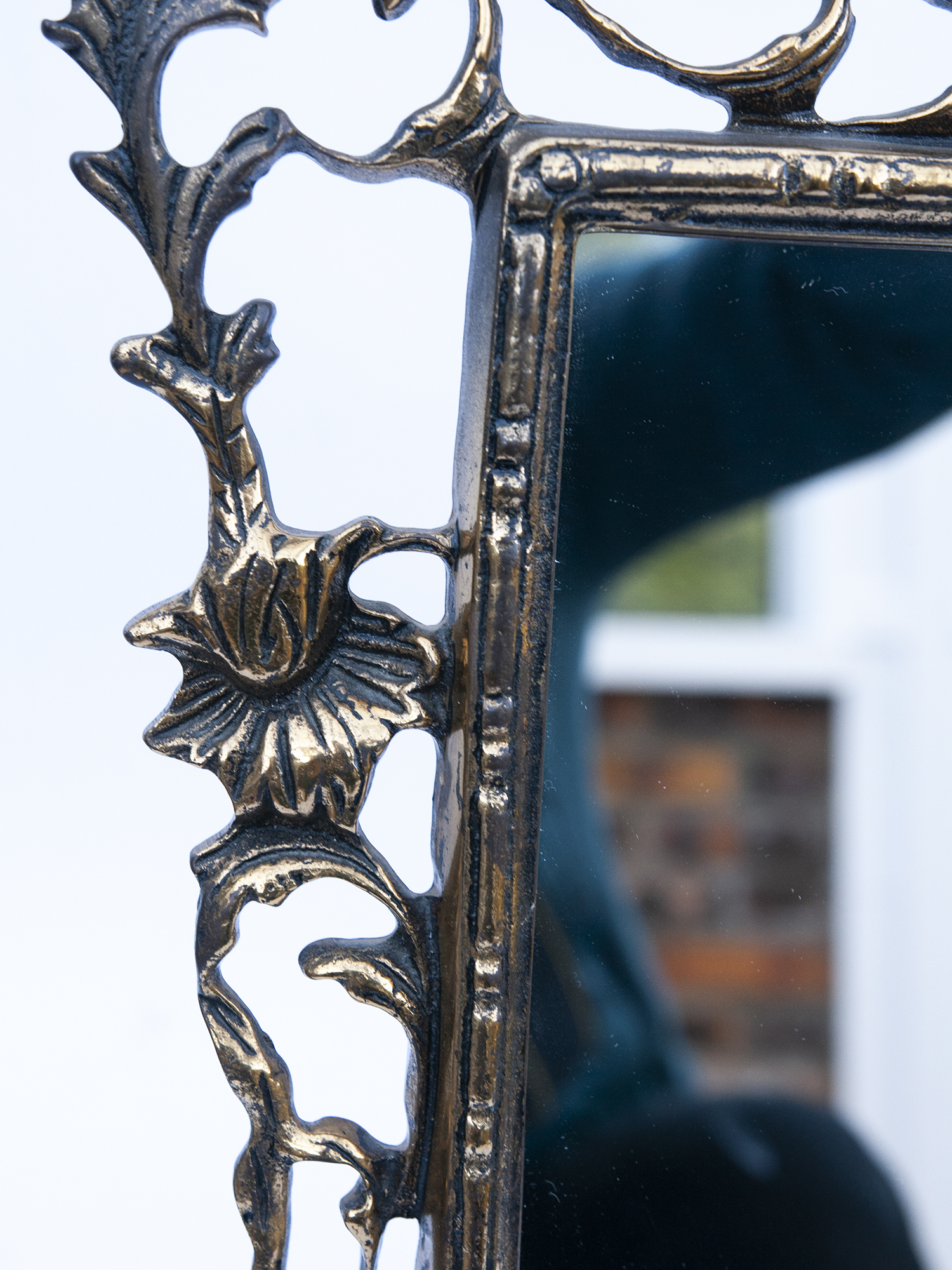 Its ornate brass/bronze frame is richly decorated with scrolling foliage and floral motifs inspired by the Rococo style. The golden patina highlights every curve and detail, giving this mirror a timeless character.