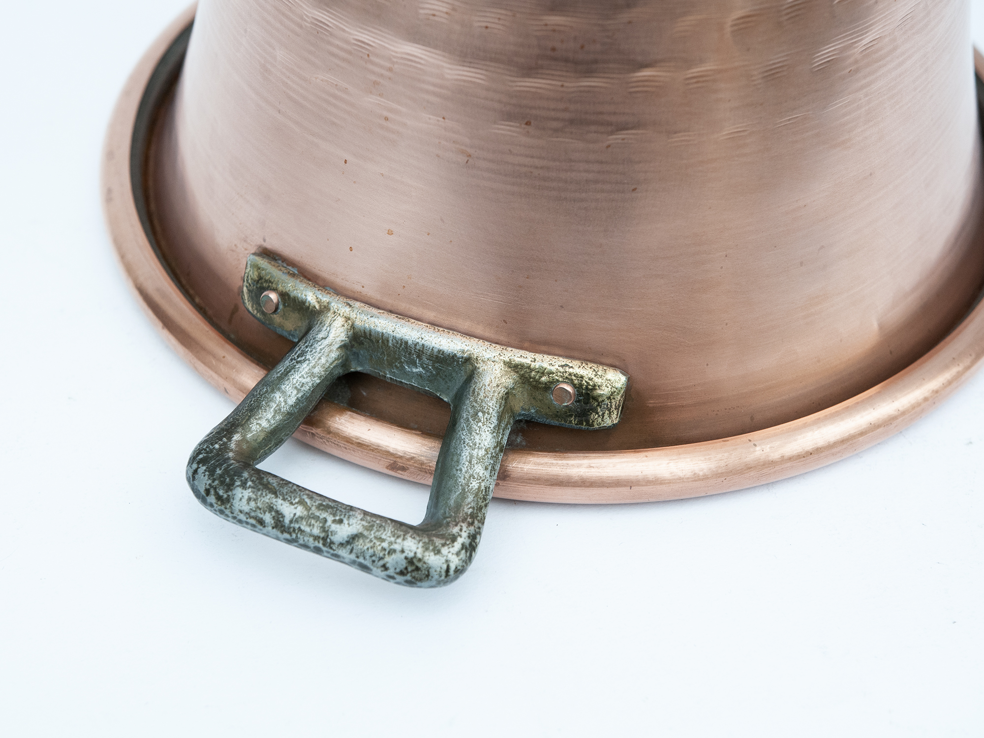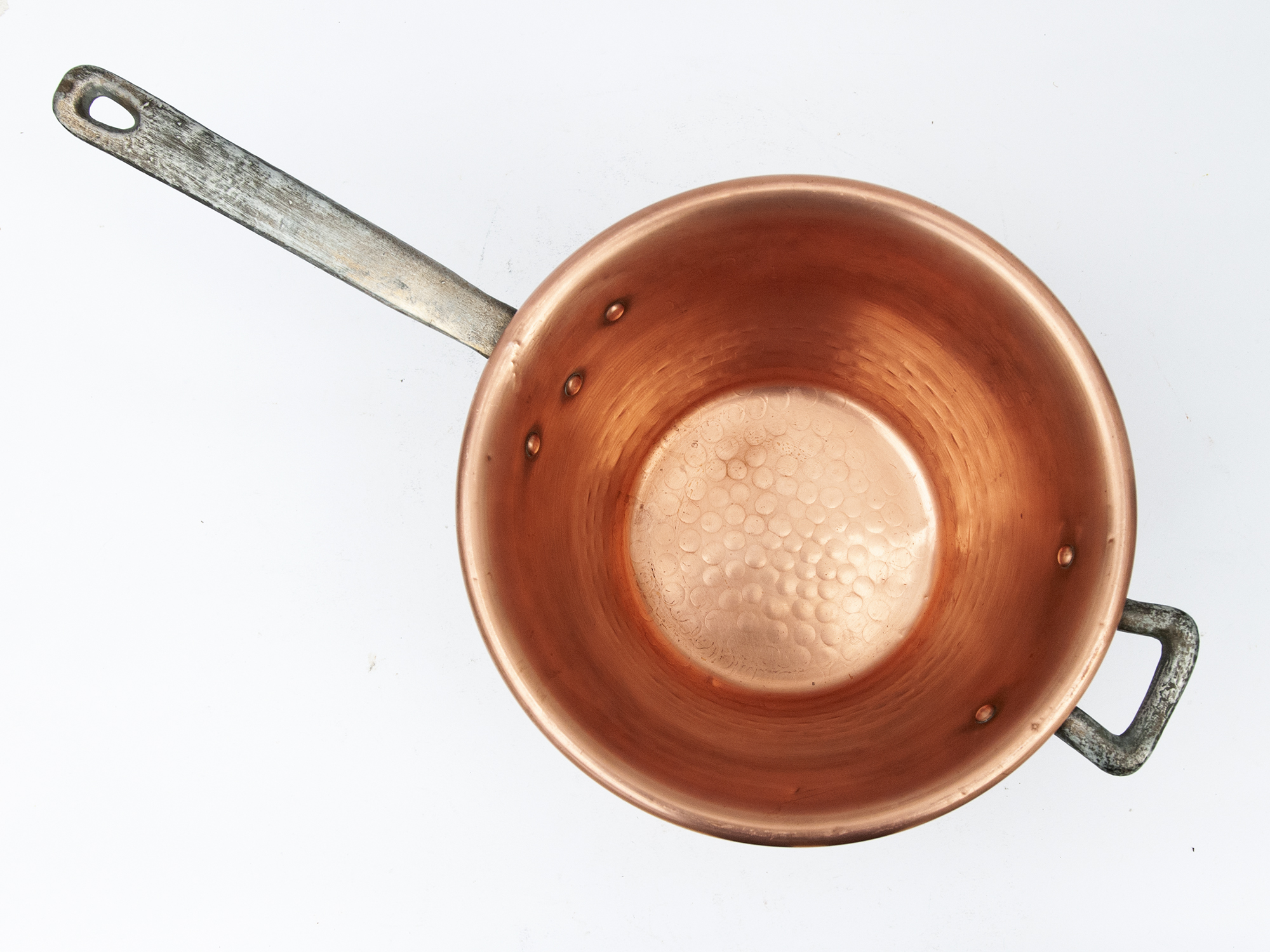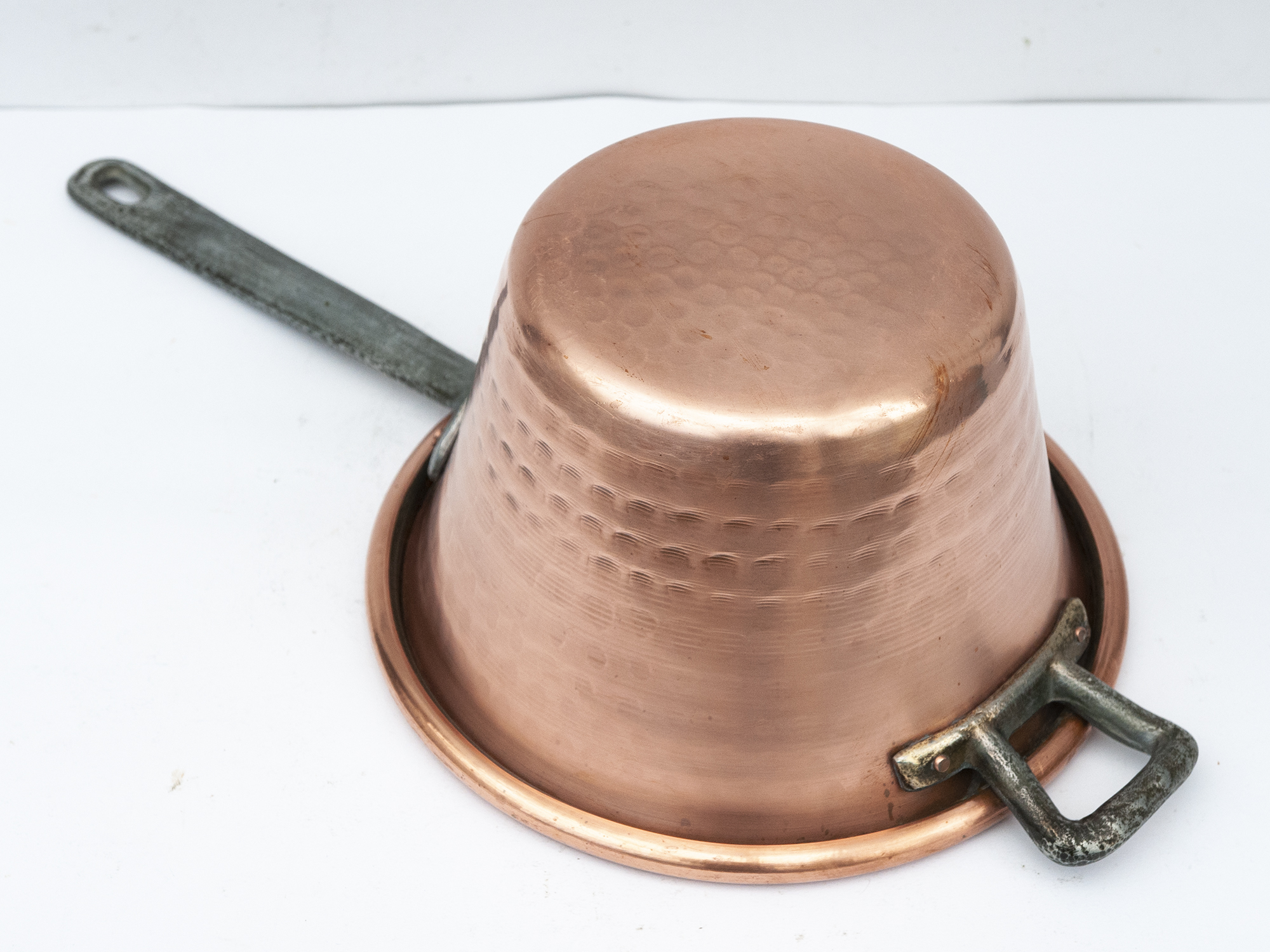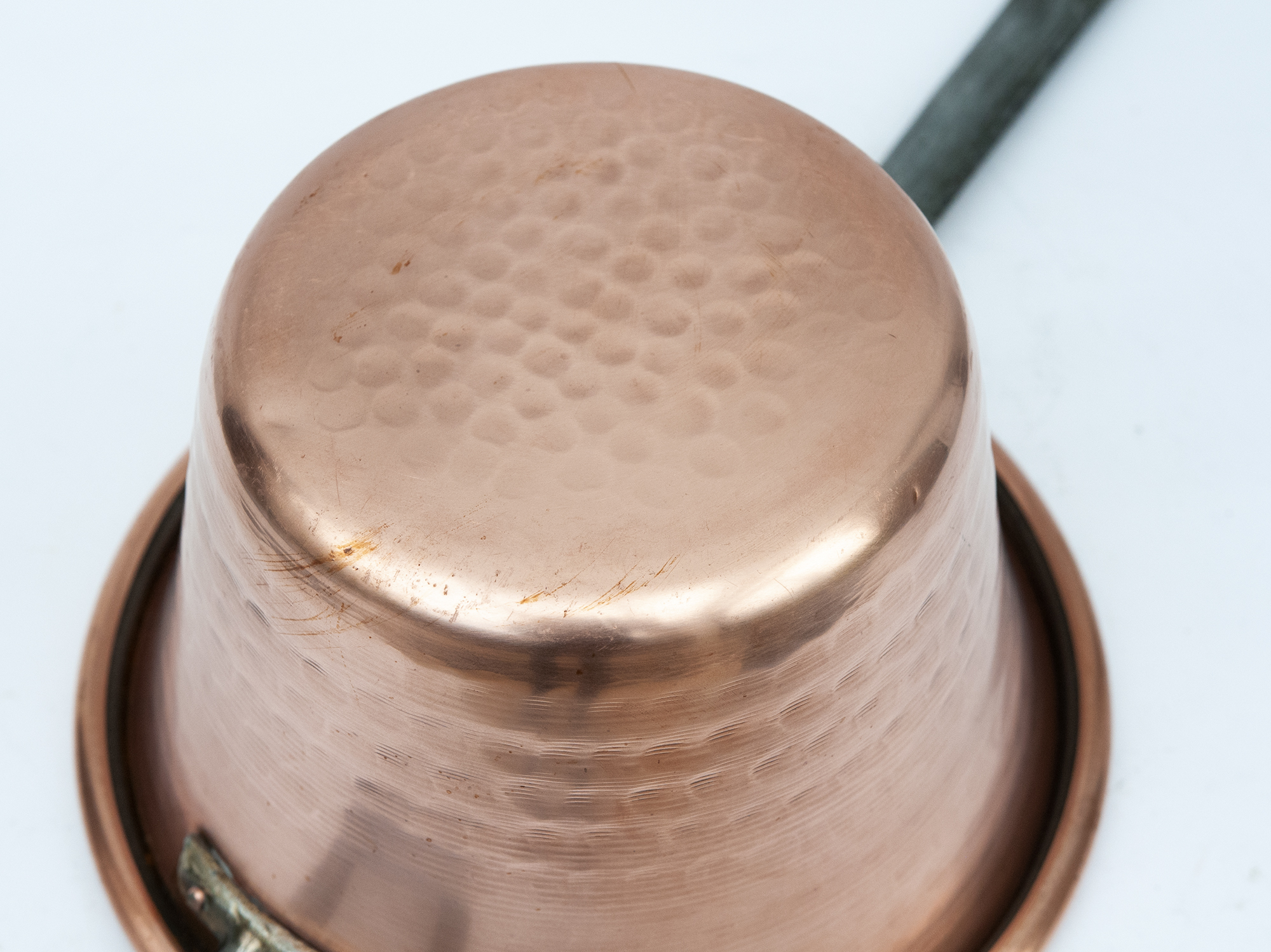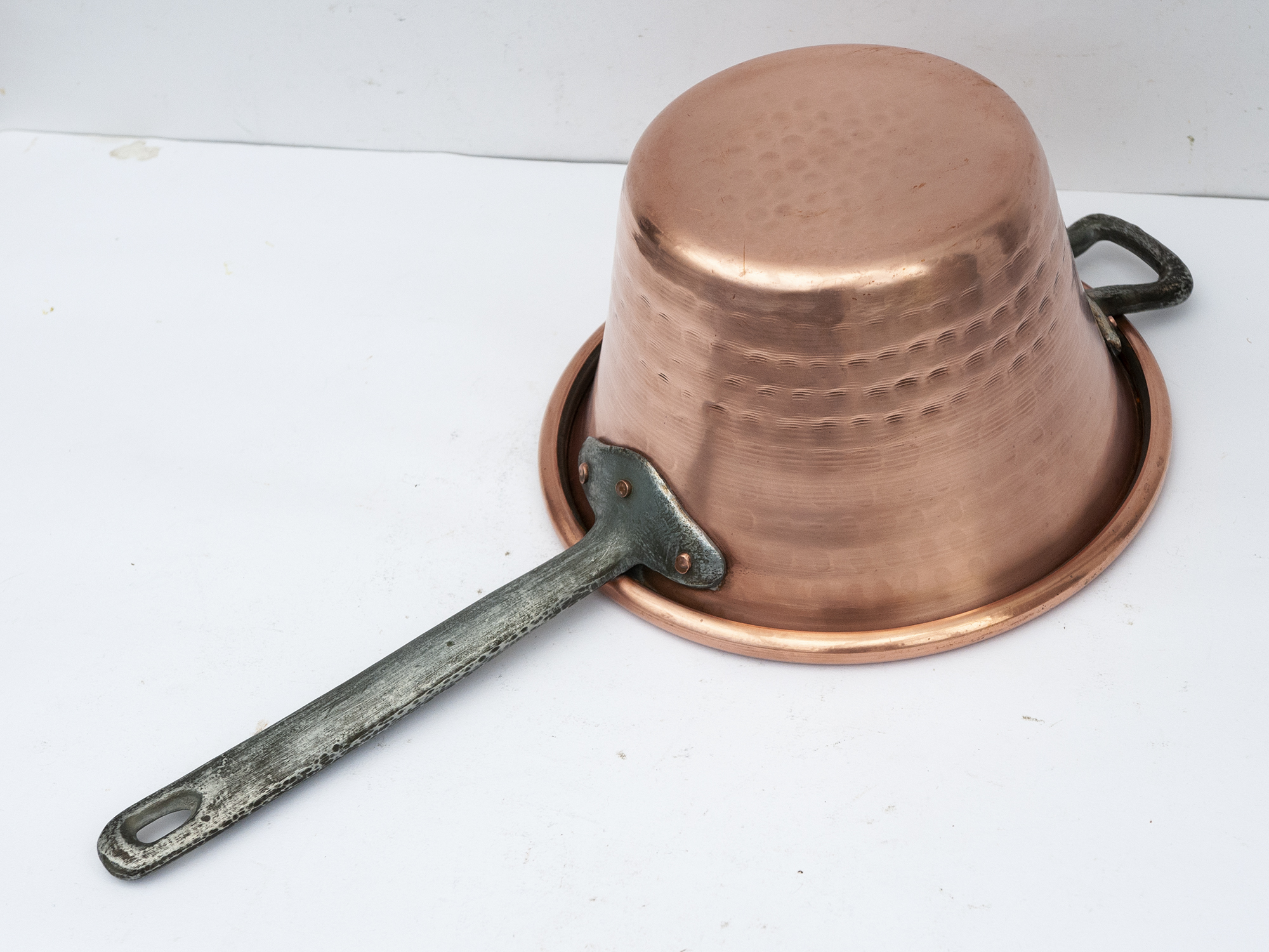 The hammered copper body provides excellent heat distribution, while the long handle allows for safe handling during slow cooking.