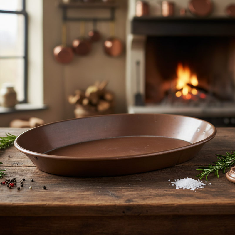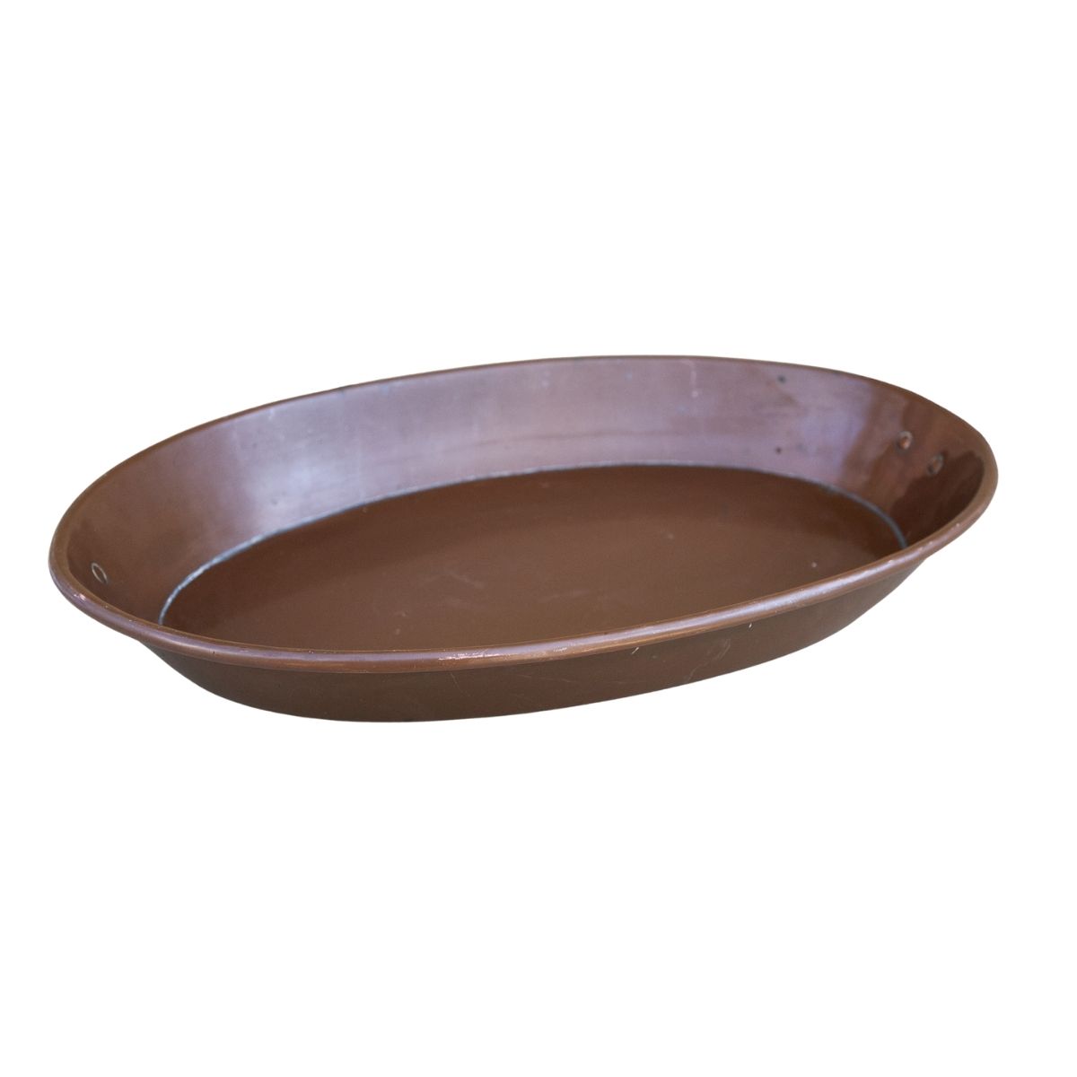 Vintage French oval roasting pan in copper. A classic french cookware with beautiful patina and color. A wonderful addition to your collection of French country copper pieces, to display in your kitchen or hang on the wall. There’s a hanging ring on one side, the other one is missing. It can be professionally tinned for cooking at buyer’s expense. Then, this pan would be great for roasting and baking classic French dishes like cheese and potato gratins. Dimensions: 15.5 x 10 x 2โ /// 39 x 26 x 5 cm (Length x Width x Height). Total weight: 2.2 lbs /// 1 kg. State: the pan shows one dent, scratches and small stains. It may not sit flat. One handle is missing. For those of you who love French Country pieces with the grace of time only.
