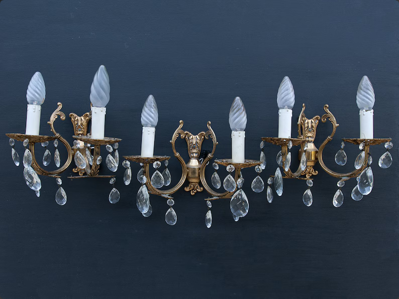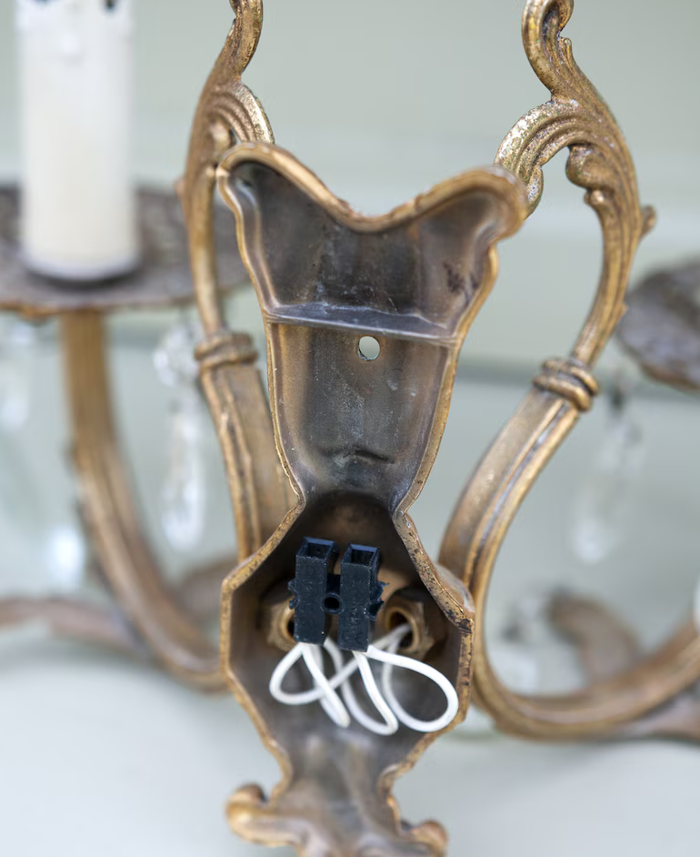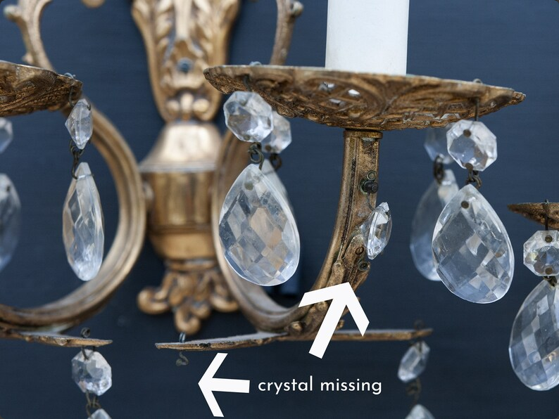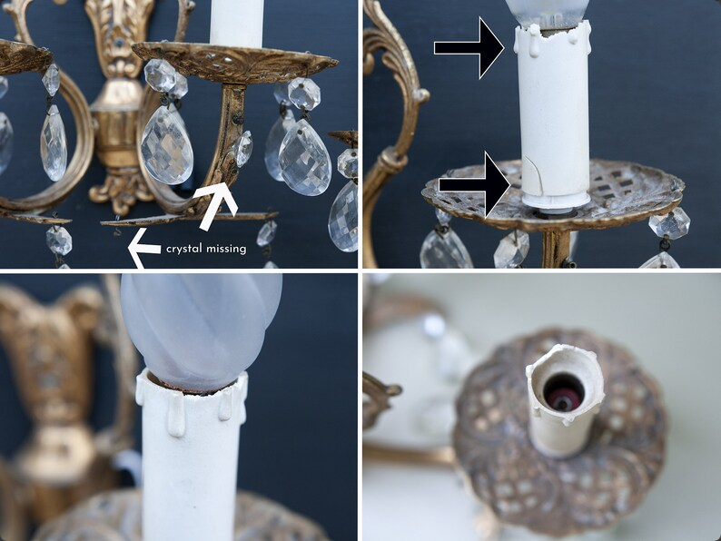 These sconce are in great condition with beautiful patina. Crystal / glass prisms can show micro scratches. The plastic candles are damaged (especially one) and deserve to be changed if you plan to redo the electrical system.