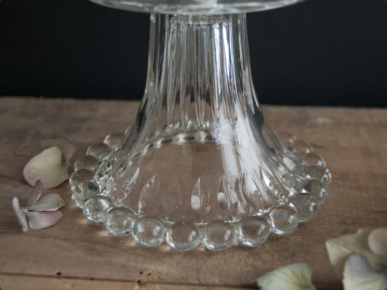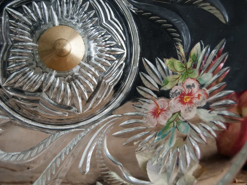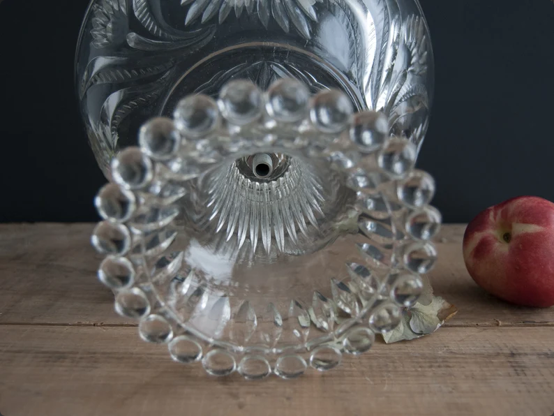 This delicate vintage French fruit bowl is made of beautifully molded clear glass with a raised botanical pattern and softly painted floral details inside the bowl. The floral motif, combined with the faceted stem and beaded base, gives the piece a light, romantic presence that feels both decorative and timeless.