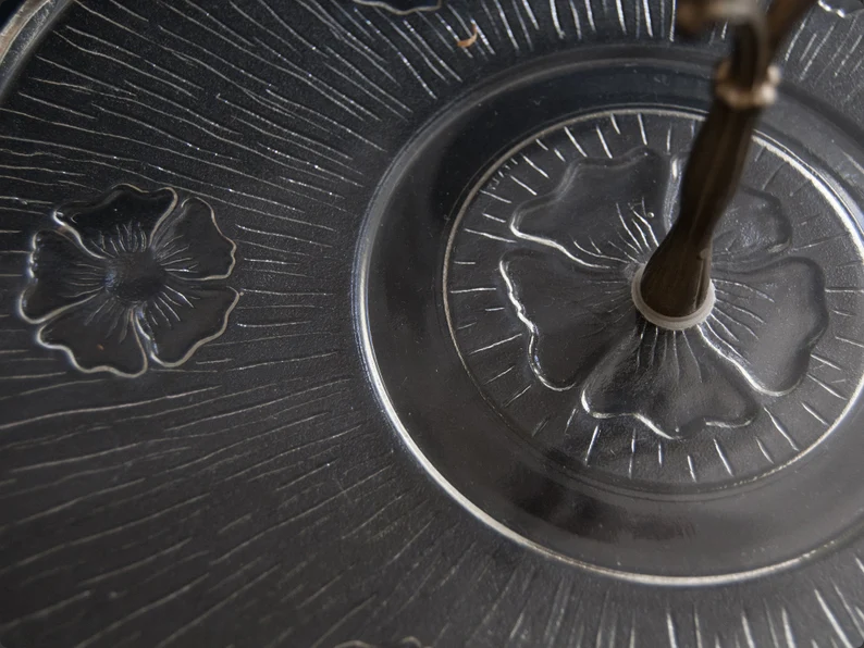 This elegant vintage French cheese plate features a beautifully textured glass surface decorated with radiating lines and raised floral motifs, all framed by a softly scalloped edge with a subtle gilt accent. The central brass handle adds both function and sculptural charm, making it easy to carry while also giving the piece its distinctive Art Deco inspired silhouette.