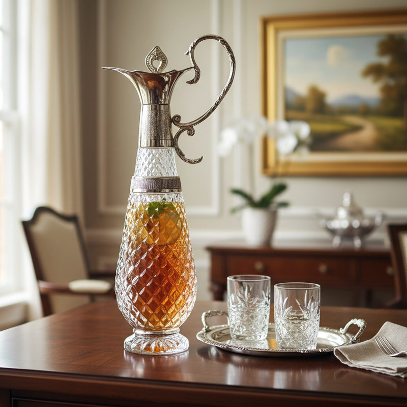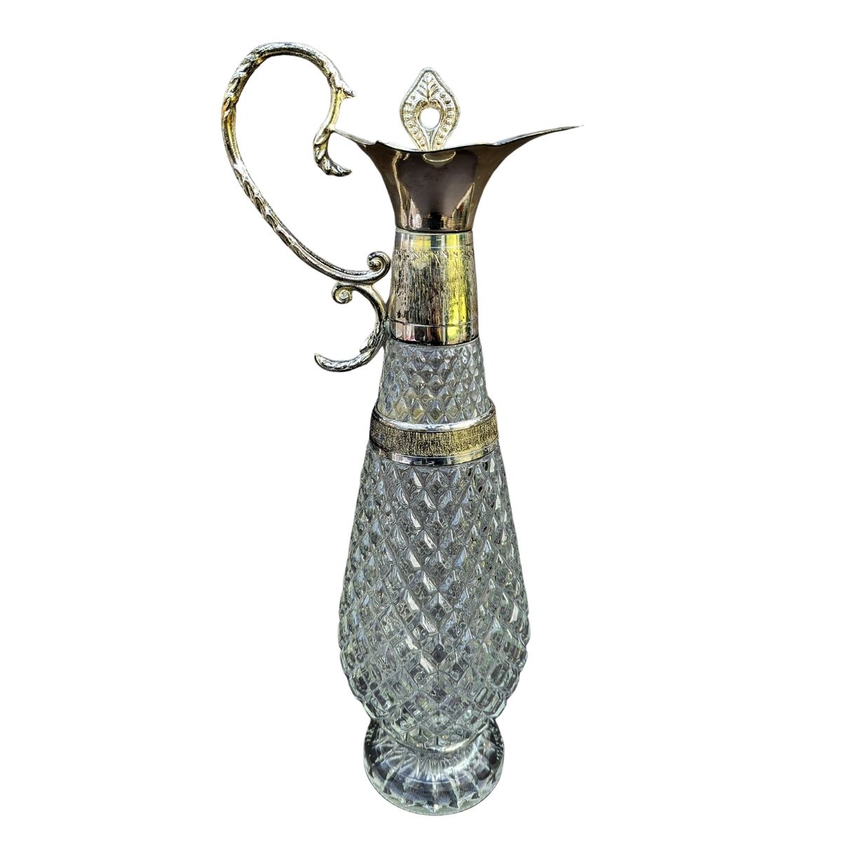 ♥ DESCRIPTION ♥ This vintage cut glass carafe, often referred to as a pitcher or “aiguière” in French, features silver sheet metal elements. It boasts an elegant Art Nouveau-style handle and a tight-fitting stopper. These French pitchers were generally used for serving wine. ♥ DIMENSIONS ♥ – Height: 14″ ♥ WEIGHT: 2.1 lbs ♥ CONDITION ♥ This carafe is in good condition with normal signs of wear, including small stains on the metal and areas where the “silver plating” has worn away.