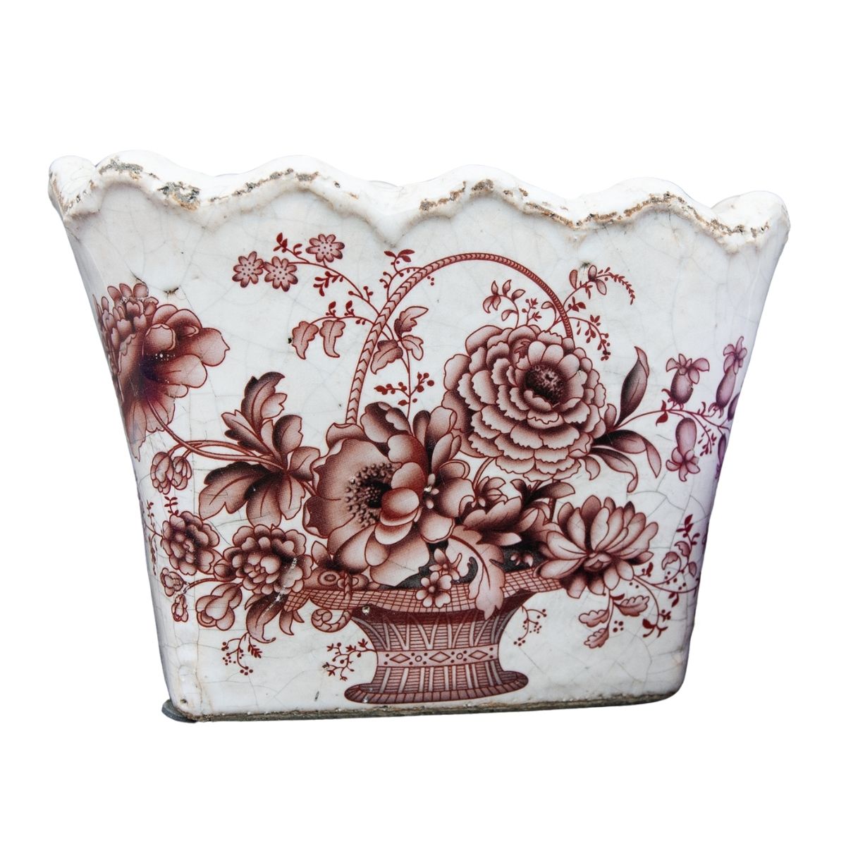 Add a touch of French country charm to your home with this antique French ceramic planter. Featuring an exquisite floral basket motif in rich burgundy tones, this piece is a true testament to 19th-century craftsmanship. Its scalloped edges and delicate details make it a perfect accent for a windowsill, console table, or as a centerpiece.
