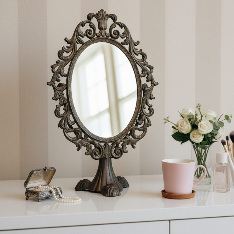 Add a touch of romantic elegance to your dressing table with this vintage Italian gold metal vanity mirror from the 1960s/70s. Featuring an ornate baroque-style frame, this swivel mirror allows for easy angle adjustments, making it both functional and decorative. Its antique gold finish enhances its charming vintage appeal, perfect for boudoir, bedroom, or bathroom décor.