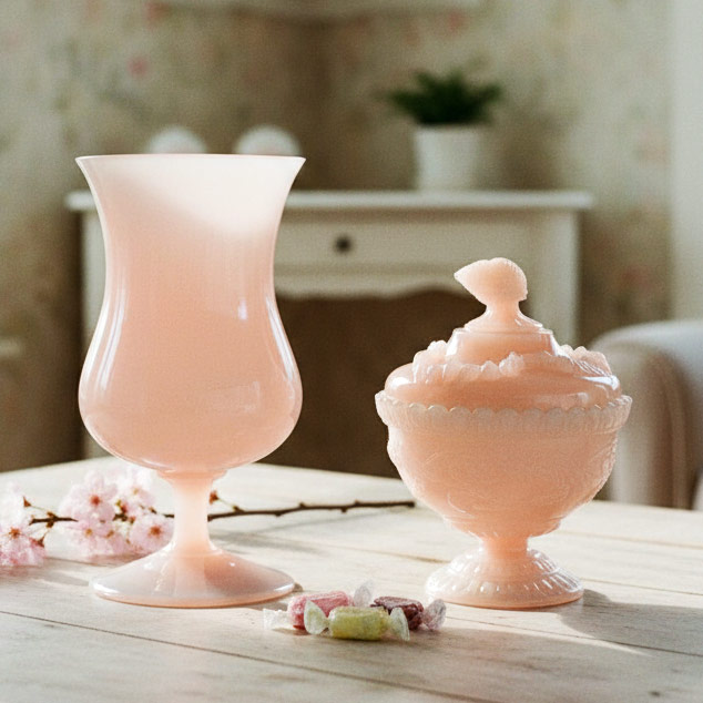 Bring a touch of French elegance to your home with this stunning vintage pink opaline glass set. The set includes a beautiful Medici-style chalice vase and a delicately decorated Portieux candy box, featuring intricate shell motifs. These high-quality, handcrafted pieces exude sophistication and will make a gorgeous addition to a vintage-inspired interior. Perfect for displaying flowers, storing sweets, or as elegant collectibles.