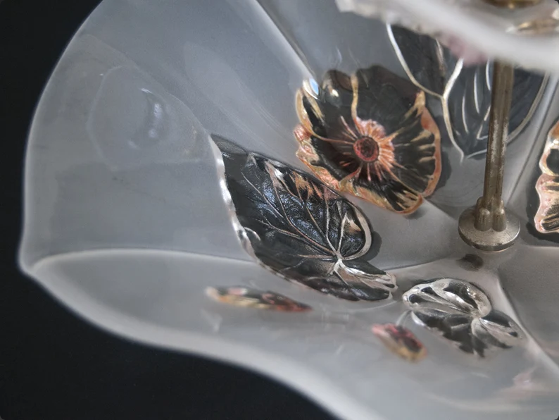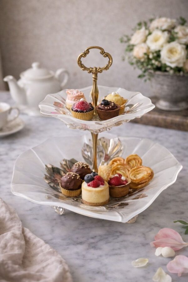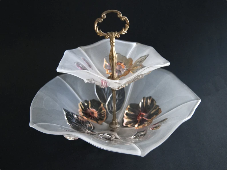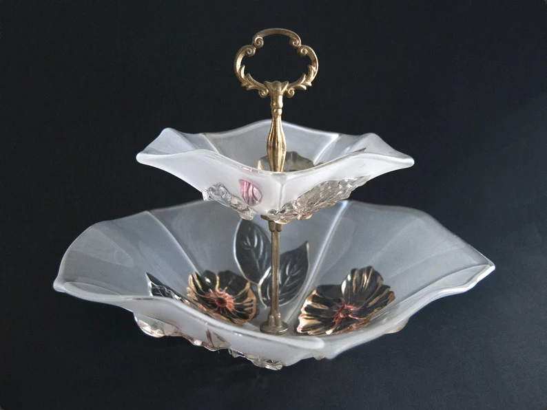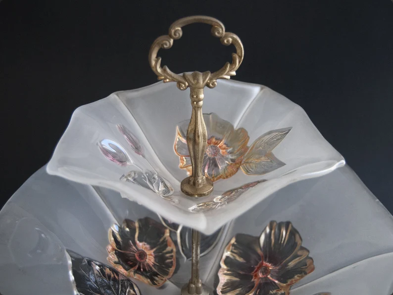 This elegant vintage two tier serving stand is both delicate and sculptural, with softly frosted glass plates shaped like open petals and decorated with raised floral and leaf motifs in soft metallic tones. The gentle translucency of the glass combined with the warm brass handle creates a refined and slightly romantic look that feels timeless.