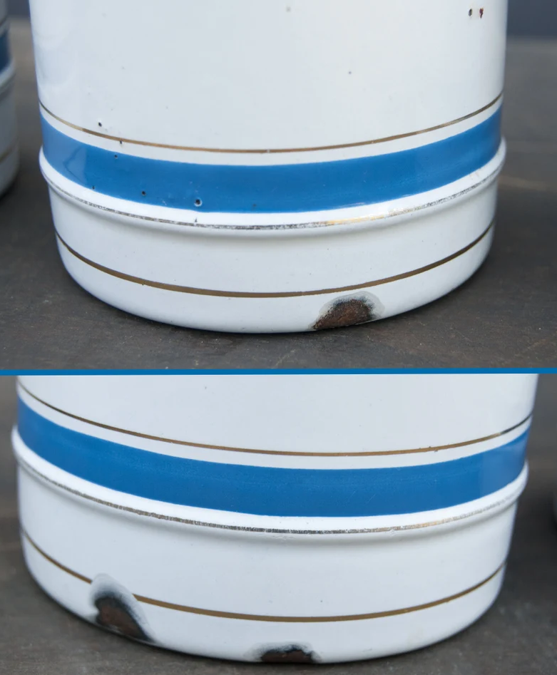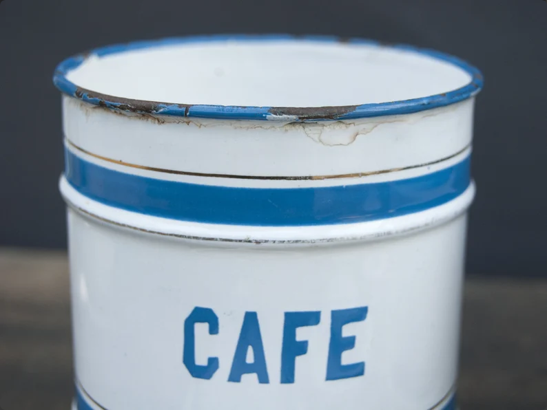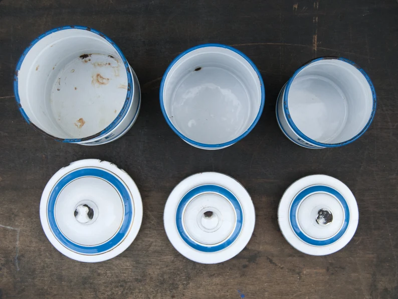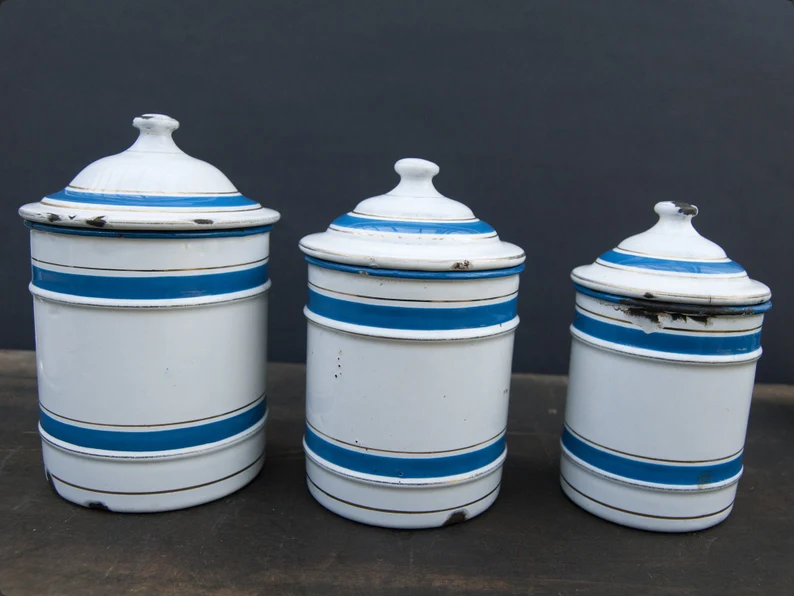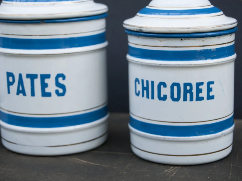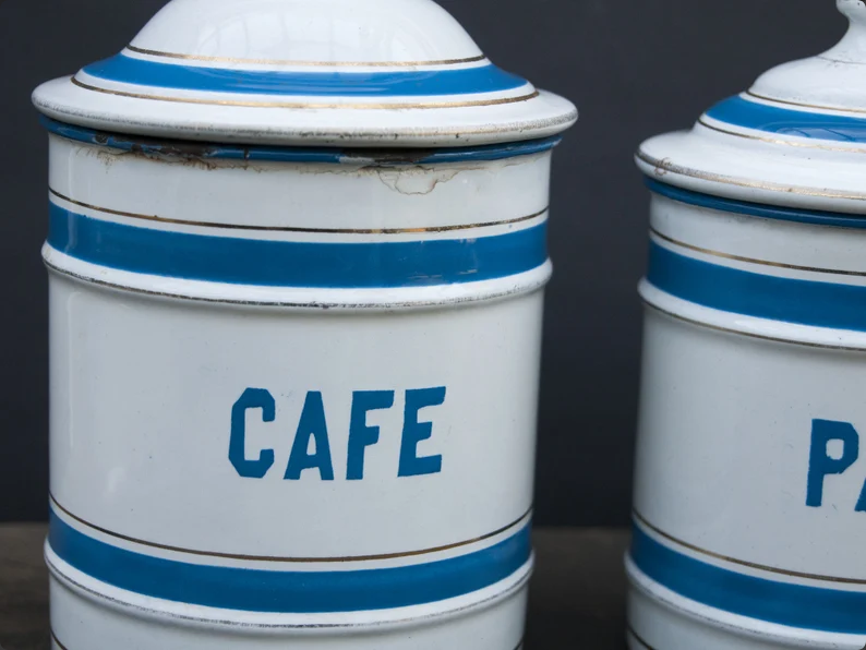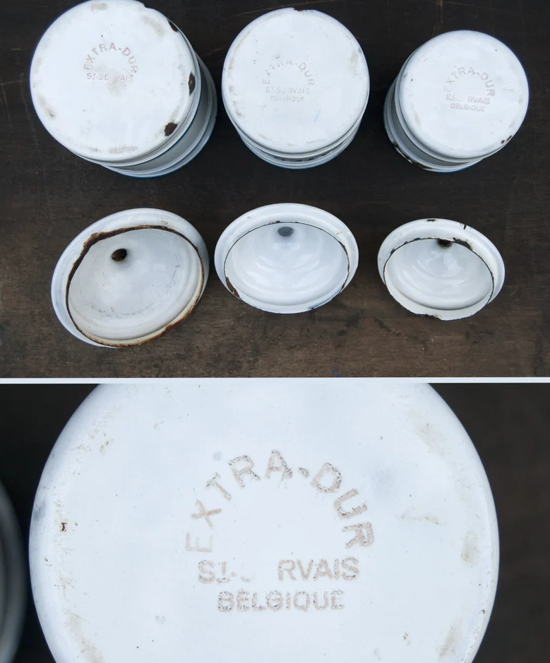 Set of 3 French kitchen canisters in white and blue enamel: coffee, pasta, and chicory. Made in Belgium, stamped “Extra Dur St Servais Belgique.